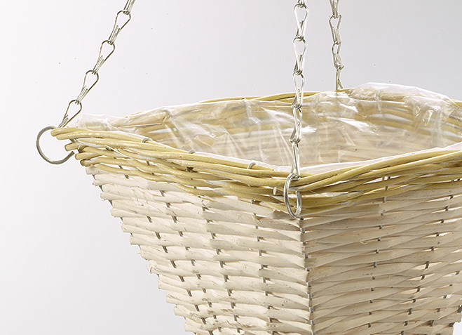 Startseite » Garten » Blumenampeln » Blumenampel aus Weide weiß eckig spitz mit curryfarbenem Rand aus Polyrattan