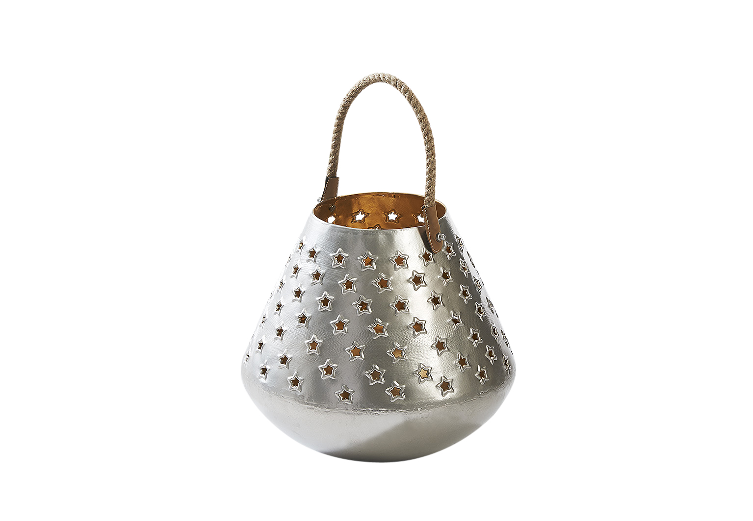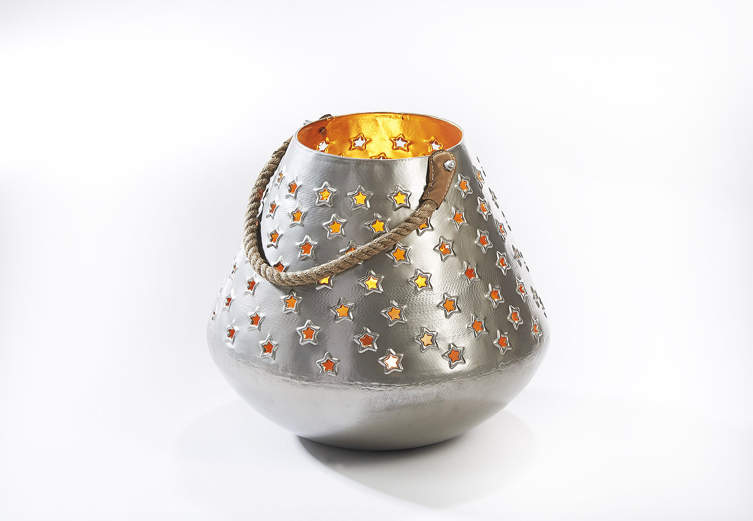 Startseite » Garten » Laternen » Laterne aus Metall mit augestanzten Sternen silber/gold Größe M ohne Deko