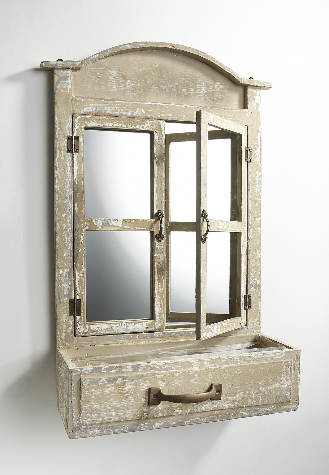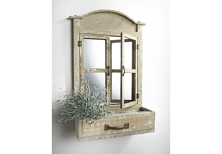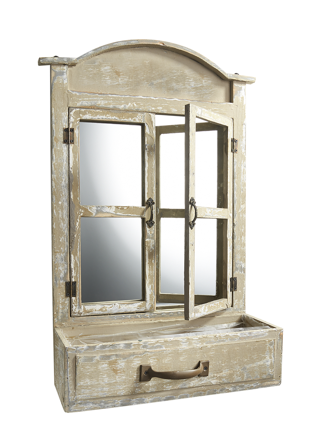 Ausgefallenes Deko-Fenster aus Holz mit einem Spiegel von Kobolo. Bestens geeignet für Kräuter oder Blumentöpfchen. Als Dekoelement gibt es Ihrem Haus oder Garten einen mediterranen Touch. Auch als Geschenk ein echter Hingucker. Länge 36cm x Breite 13cm x Höhe 9cm