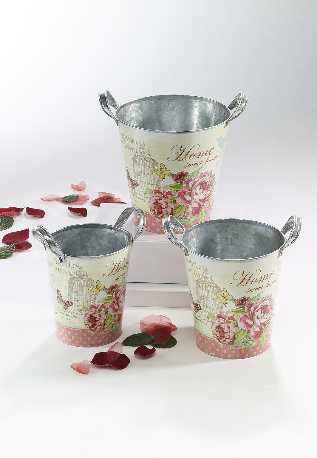 Dieses dekorative Übertopf-Set aus Zinkblech, mit modernem Rosendesign von Kobolo, sorgt für stimmungsvolles Ambiente auf jeder Fensterbank. Es enthält für jede Gelegenheit die passende Größe. Mit Blumen bestückt auch als individuelles Geschenk ein echtes Highlight. Ein wahrer Hingucker für Haus und überdachten Gartenbereich. Maße Ca.Gr1 Ø12cm x Höhe 14cm , Gr2 Ø15cm x Höhe 16cm , Gr3 Ø18cm x Höhe 17cm