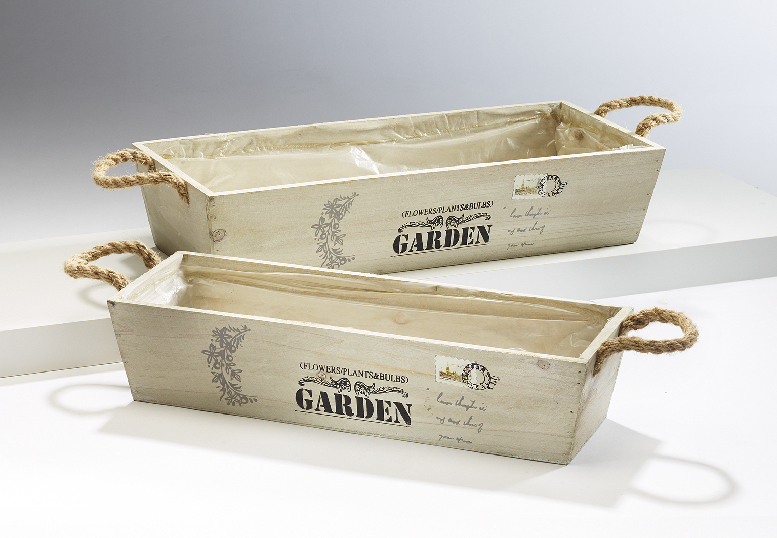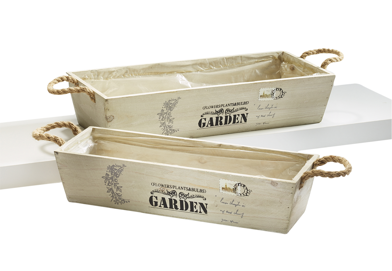 Dekoratives Set bestehend aus zwei bepflanzbaren Holzkisten mit Seilgriffenvon Kobolo. Zum Schutz des Holzes sind die Kistchen innen mit Folie ausgeschlagen. Ein wahrer Hingucker für Haus und überdachten Gartenbereich. Mit Blumen bepflanzt auch als individuelles Geschenk ein echtes Highlight. Maße Ca.Gr1 40cm x 15cm x 9 cm , Gr2 45cm x 19cm x 10cm