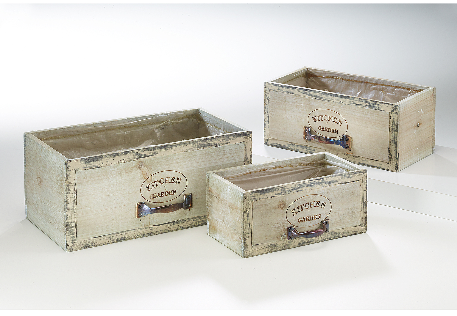 Die Pflanzschalen aus Holz von Kobolo im angesagten Vintage-Look sind mit Folie ausgeschlagen und eignen sich hervorragend zum Bepflanzen. Die außergewöhnliche Schubladenform wird Sie begeistern und das Highlight jeder Dekoration sein. Ein wahrer Hingucker für Haus und überdachten Gartenbereich und das Set beinhaltet für jeden Anlass die richtige Größe. Mit Blumen bepflanzt auch als individuelles Geschenk verwendbar. Maße Ca.Gr1 22cm x 12cm x 10cm , Gr2 27cm x 14cm x 12cm , Gr3 32cm x 18cm x 15cm