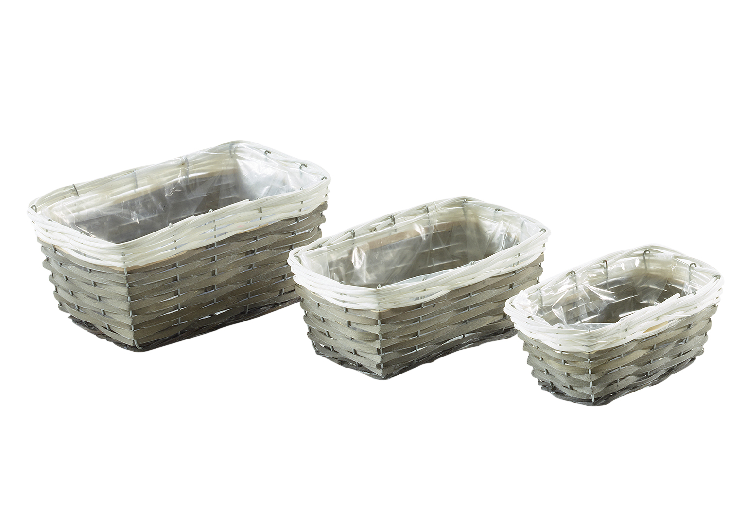Dekoratives Pflanzkorb 3er Set grau aus Chipwood von Kobolo. Die Körbe sind mit Folie ausgeschlagen und lassen sich wunderbar bepflanzen. Der weiße Rand aus Polyrattan verleiht den Körben einen frischen Touch. Mit Blumen bepflanzt auch als Geschenk zum Beispiel zu Ostern, zum Geburtstag oder Muttertag ein echter Hingucker. Maße Ca.Gr1 21cm x 13cm x 10cm , Gr2 24cm x 15cm x 11cm , Gr3 27cm x 19cm x 13cm
