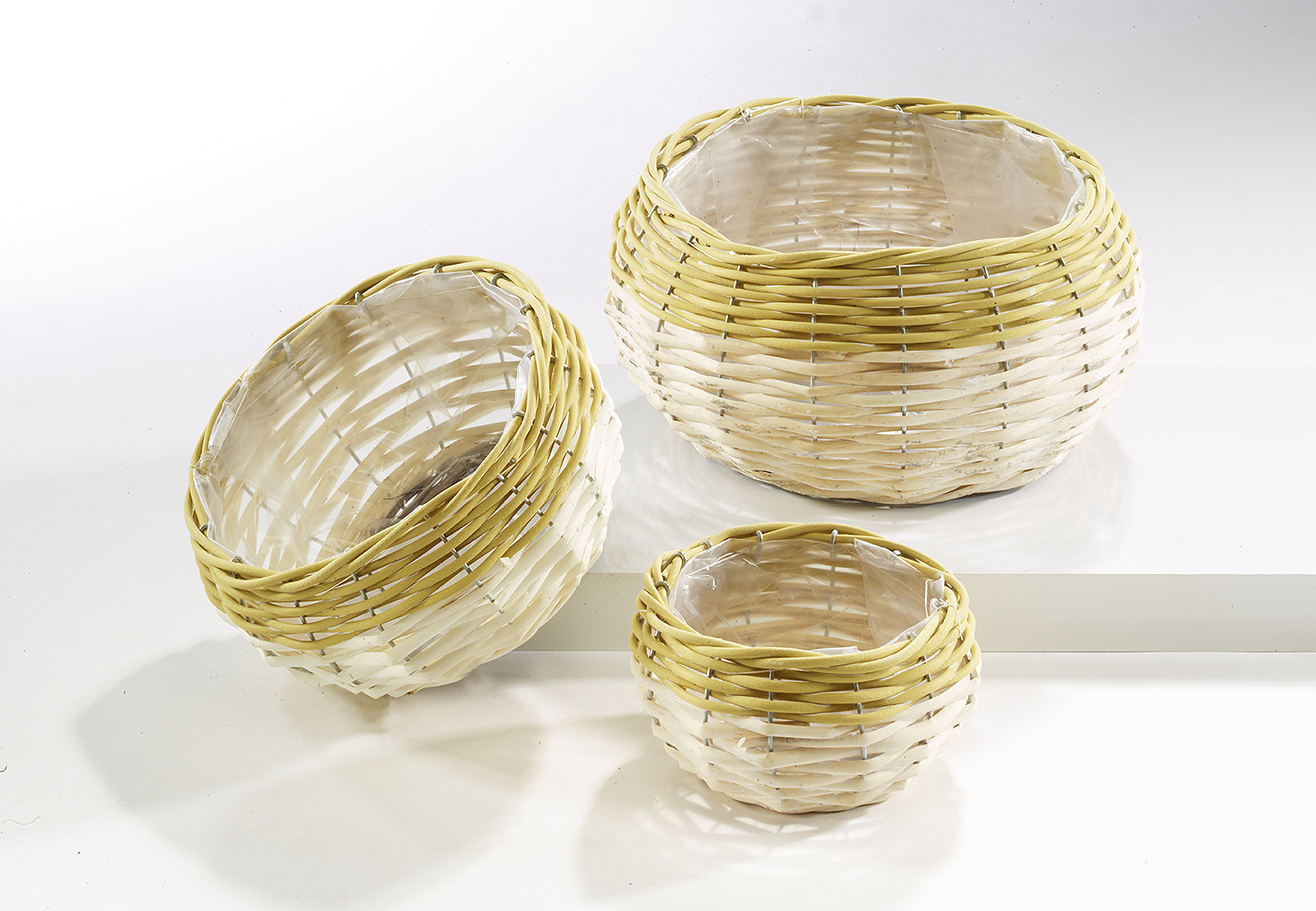 Praktisches Pflanzschalenset 3-teilig von Kobolo. Die runden Schalen sind mit Folie ausgeschlagen und ermöglichen hiermit ein sauberes Bepflanzen. In den Farben weiß und curry (Polyrattan) fügt es sich in viele Einrichtungsstile ein. Weide ist aufgrund seiner natürlichen Beschaffenheit noch immer ein sehr beliebter Werkstoff zur Herstellung von Korbwaren und durch seine hohe Belastbarkeit bietet es Eigenschaften, die denen vieler anderer Materialien überlegen sind. Maße Ca.Gr1 Ø14cm x Höhe 9 cm , Gr2 Ø19cm x Höhe 11cm , Gr3 Ø24cm x Höhe 14cm
