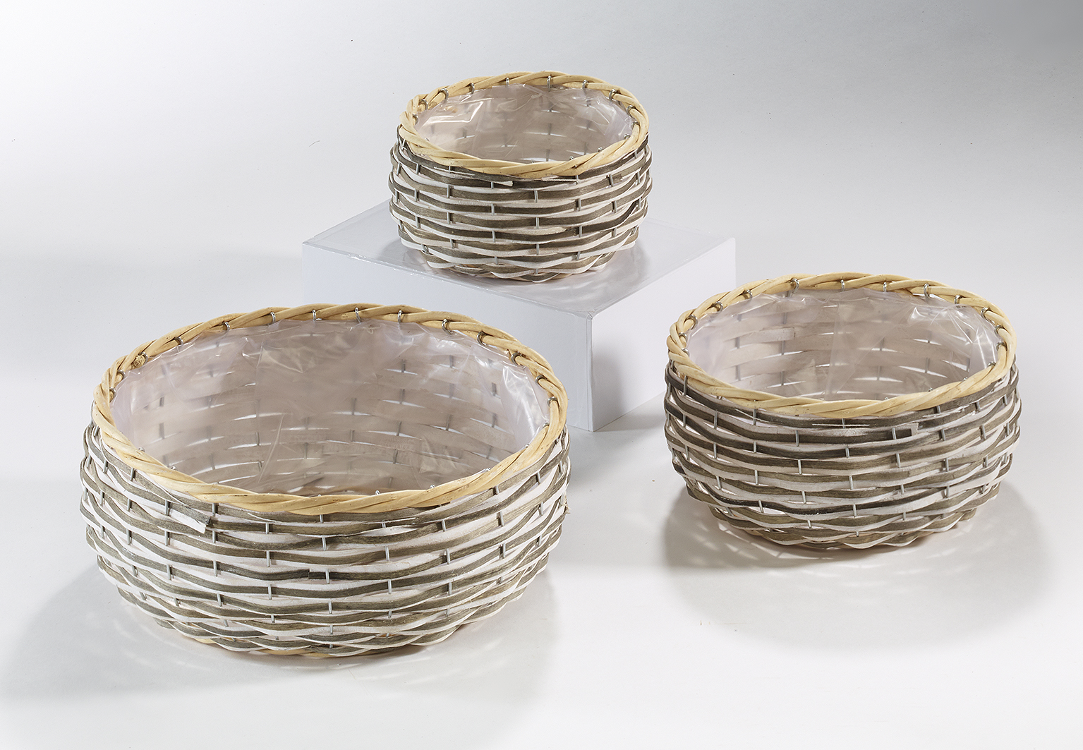 Wunderschönes Pflanzschalenset aus Weide und Chipwood von Kobolo. Dieses Schalenset eignet sich hervorragend zum Bepflanzen, da es mit Folie ausgeschlagen ist. Durch die verschiedenen Größen sehr vielfältig einsetzbar. Mit Blumen bepflanzt auch als Geschenk zum Beispiel zu Ostern, zum Geburtstag oder Muttertag ein echter Hingucker. Maße Ca.Gr1 Ø18cm x Höhe 10cm , Gr2 Ø24cm x Höhe 12cm , Gr3 Ø30cm x Höhe 13cm