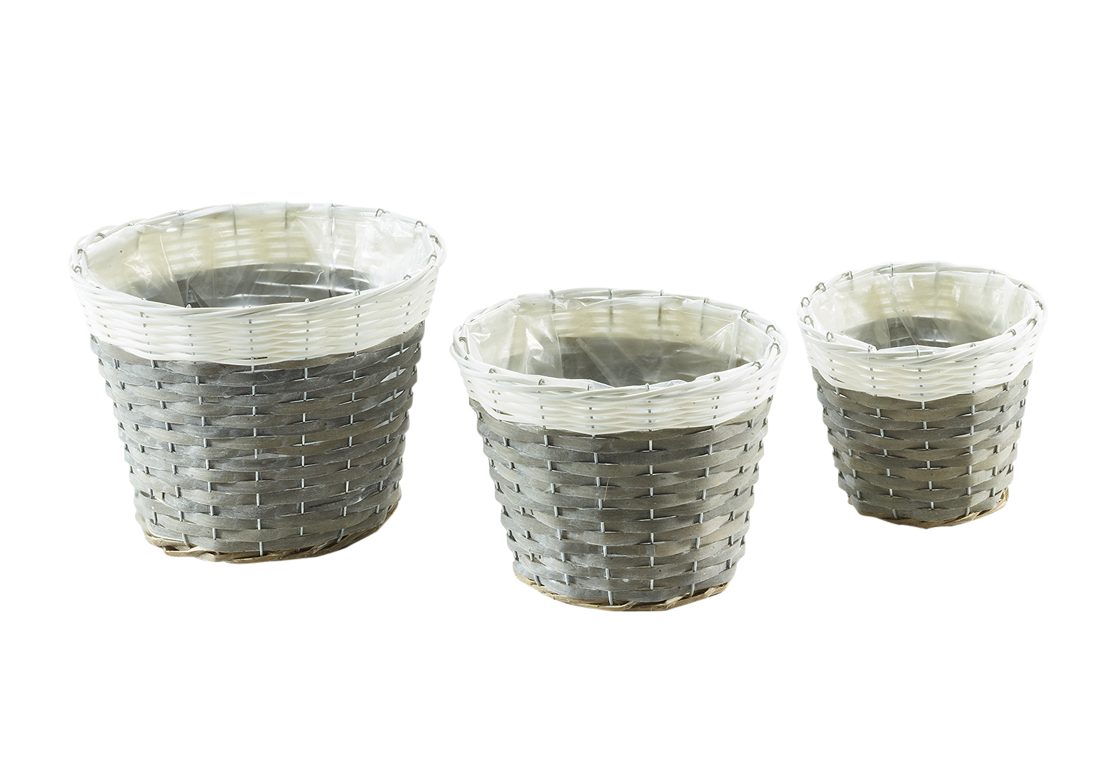Übertopf aus Chipwood und Polyrattan grau weiß runde Form m. Folie S/3