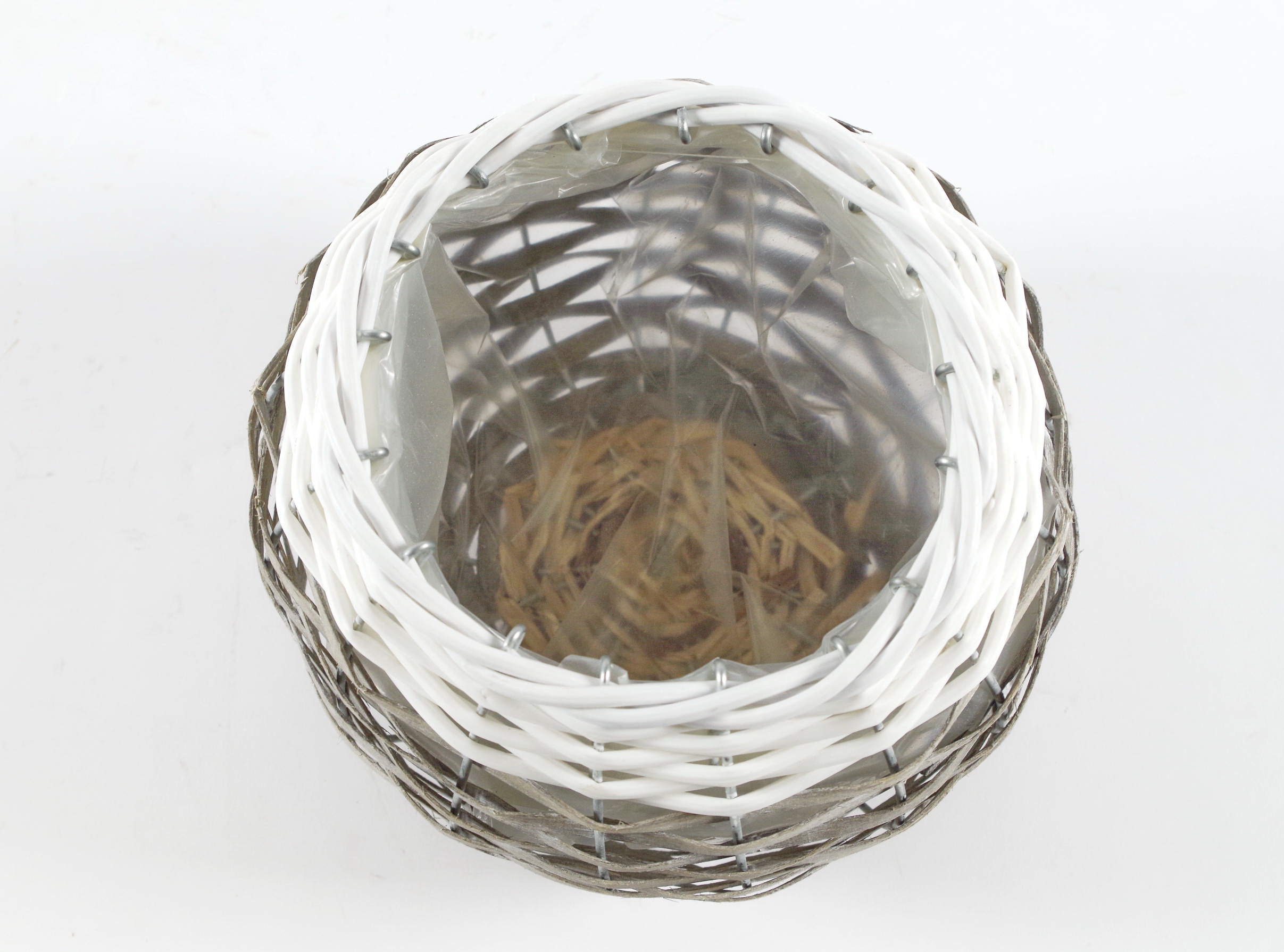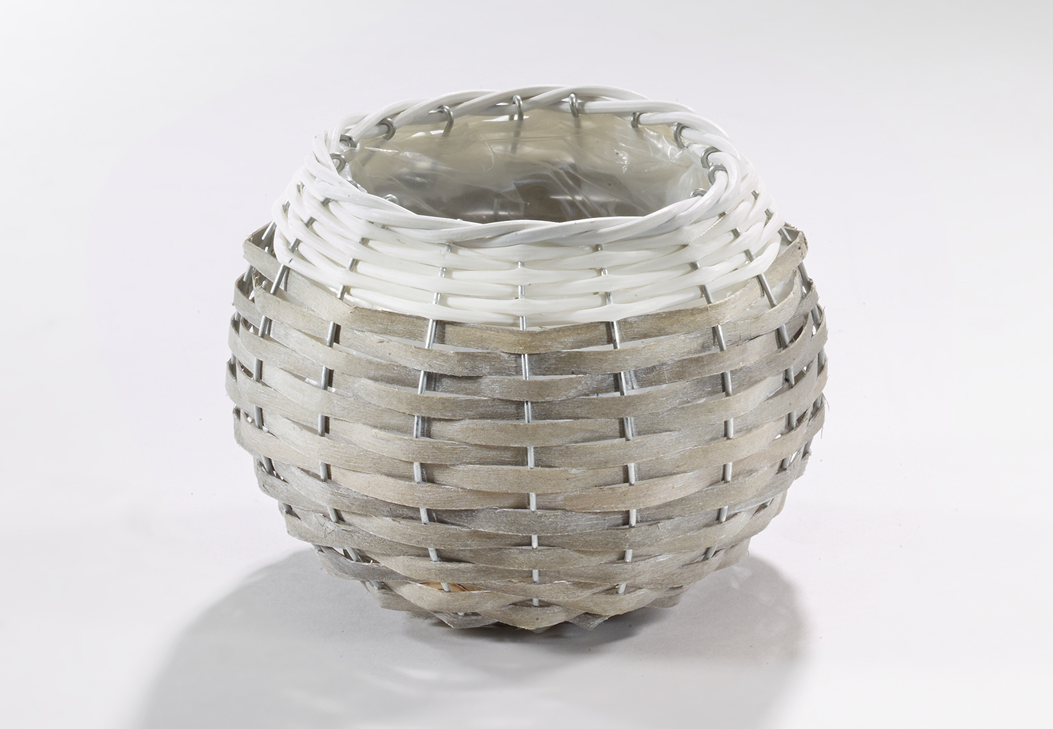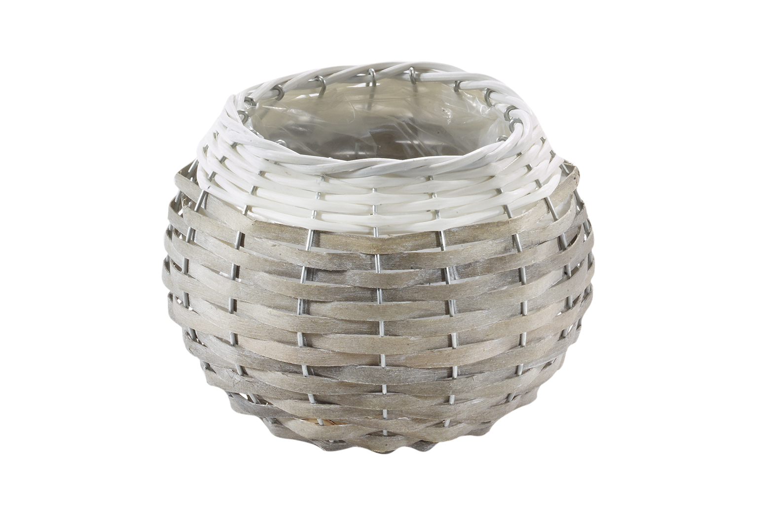 Übertopf aus Chipwood und Polyrattan grau weiß runde Form