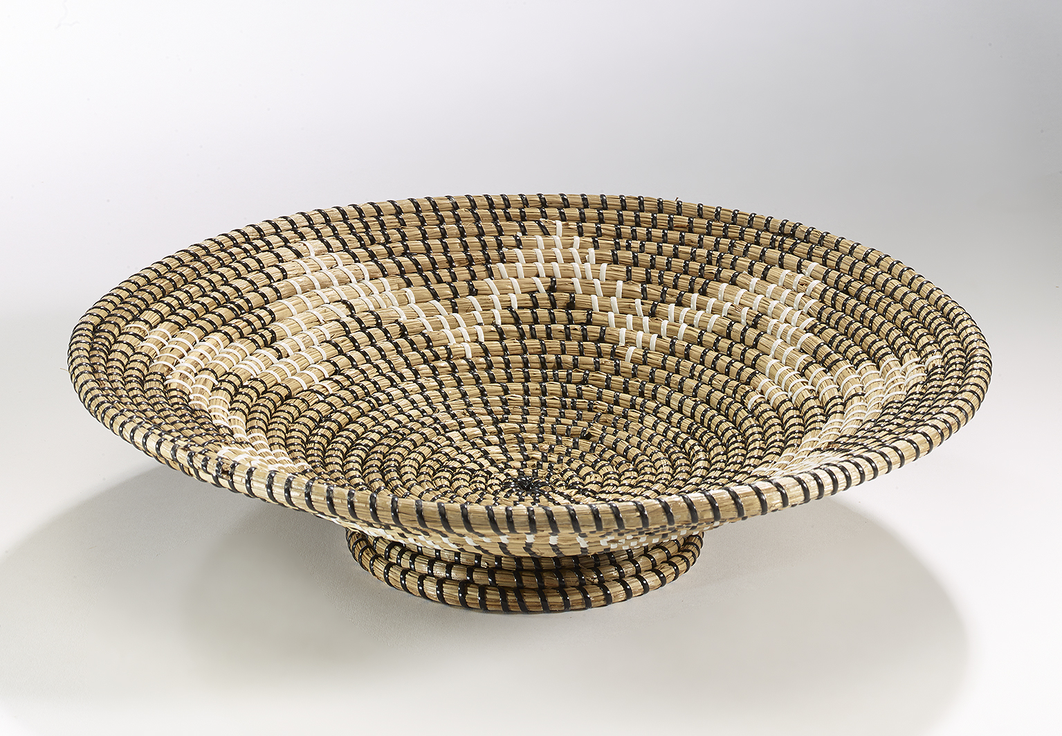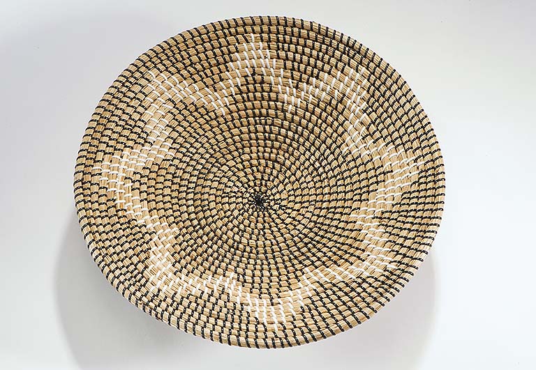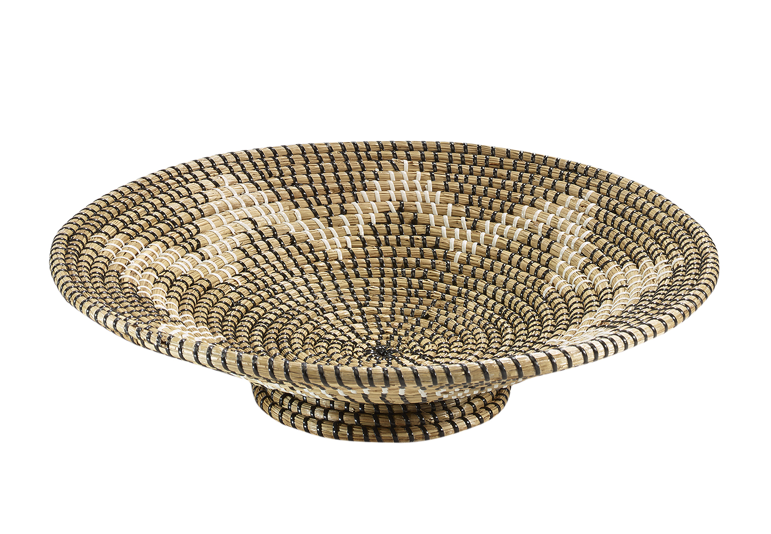 Die Dekoschale von Kobolo überzeugt durch eine Mischung aus naturfarbenem Seegras und mit schwarzem Kunststoffband umwickelten Elementen. Eine besondere Note erhält die Seegrasschale durch einzelne, mit weißem Kunststoffband umwickelte, Elemente, die einen Stern ergeben.Durchmesser 45cm x Höhe 11cm