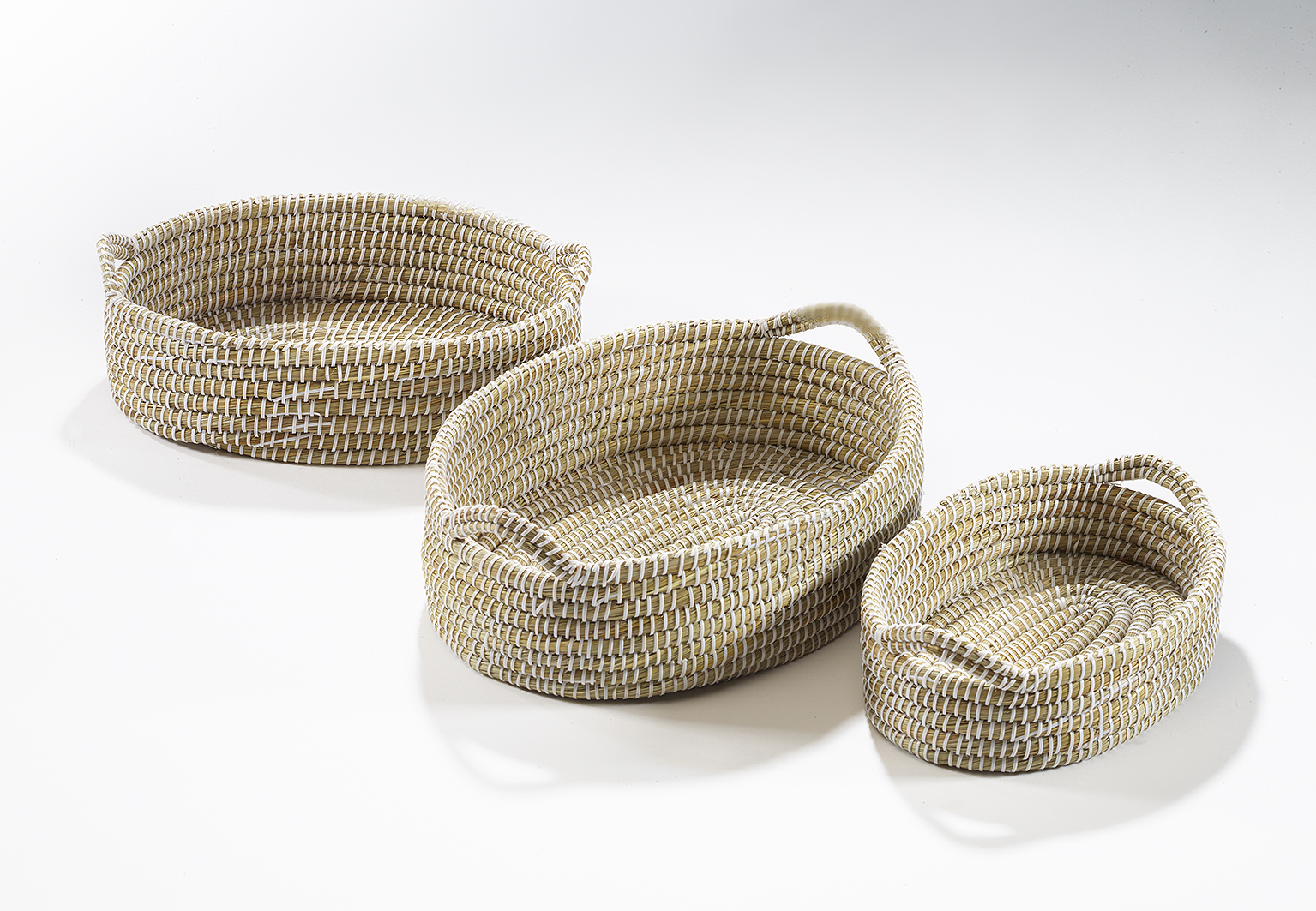 Dekoschalenset aus Gras mit Kunststoffband umwickelt. Ausgefallenes Design aus unterschiedlichen Materialien. Als Geschenkkorb oder Ordnungskorb vielseitig einsetzbar. Das Set beinhaltet für jeden Anlass die richtige Größe. Maße Ca.Gr1 26cm x 18cm x 8 cm , Gr2 30cm x 22cm x 9 cm , Gr3 34cm x 26cm x 10cm