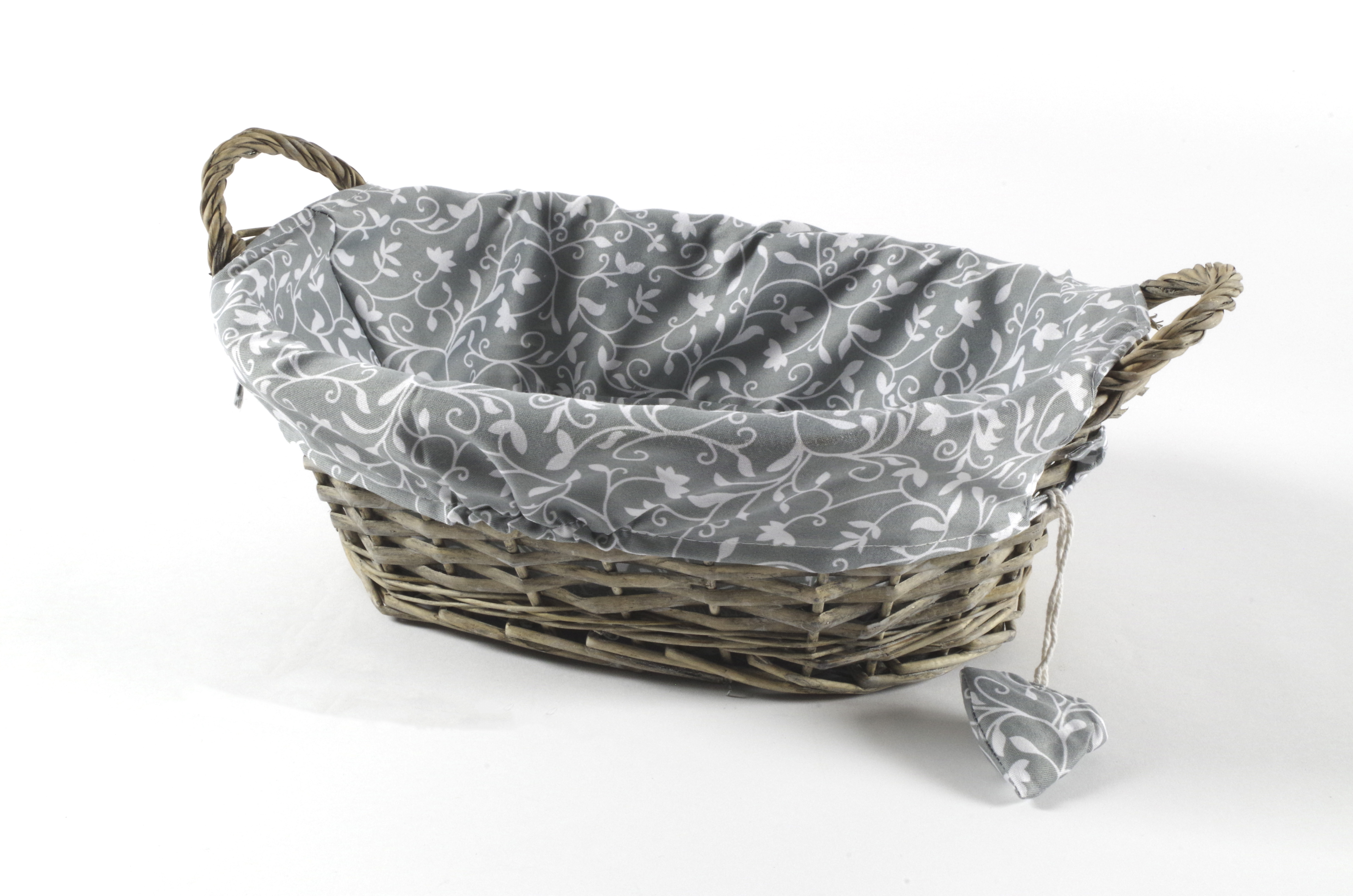 Sehr schönes ovales Körbchen von Kobolo aus grauer Weide mit trendigen Stoff und einem Herzanhänger. Ein dekoratives Highlight für Ihren Wohnbereich. Dieser Weidenkorb ist praktisch, dekorativ und für Freunde des Landhaus-Stils ein unverzichtbares Accessoires. Länge 34cm x Breite 26cm x Höhe 11cm