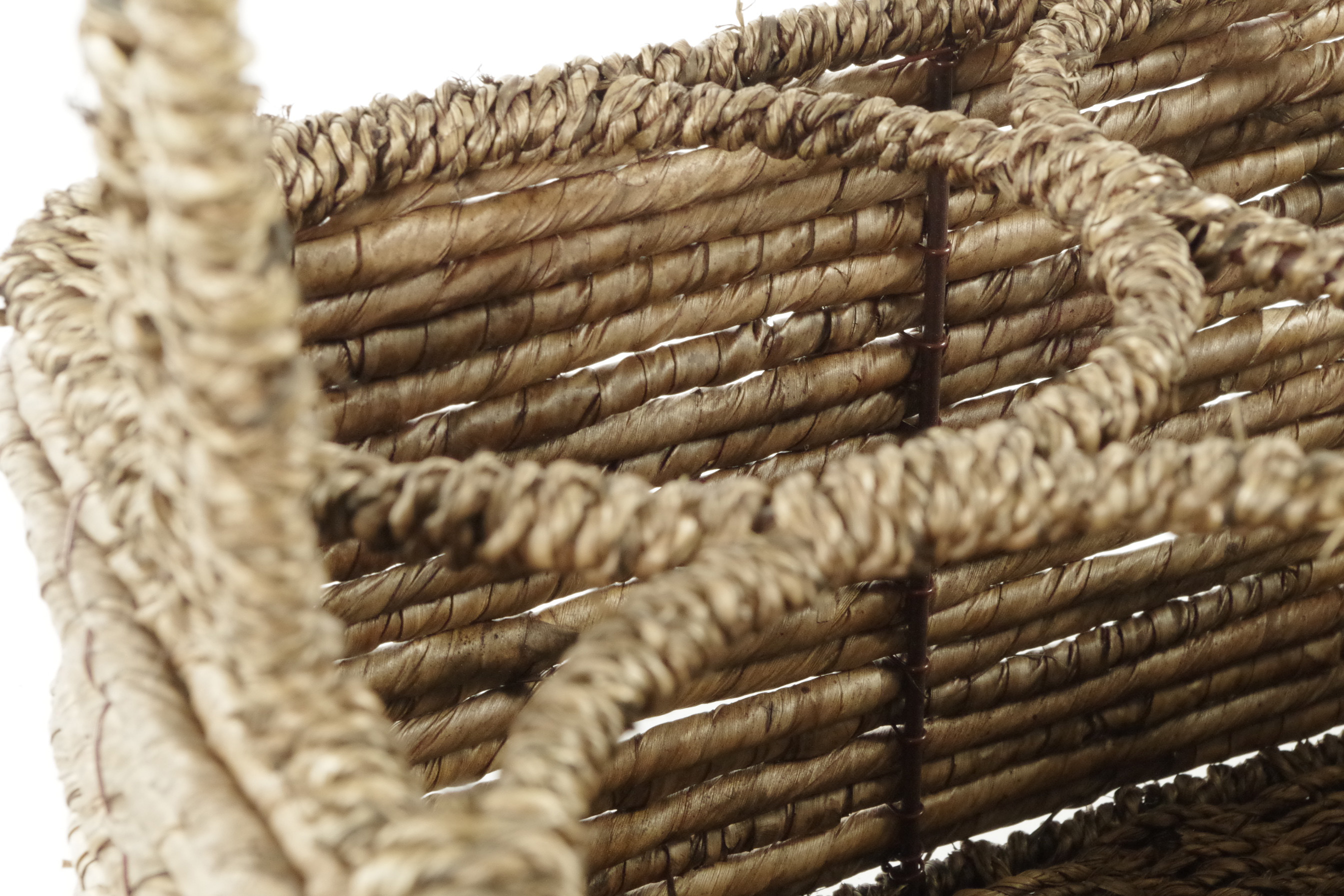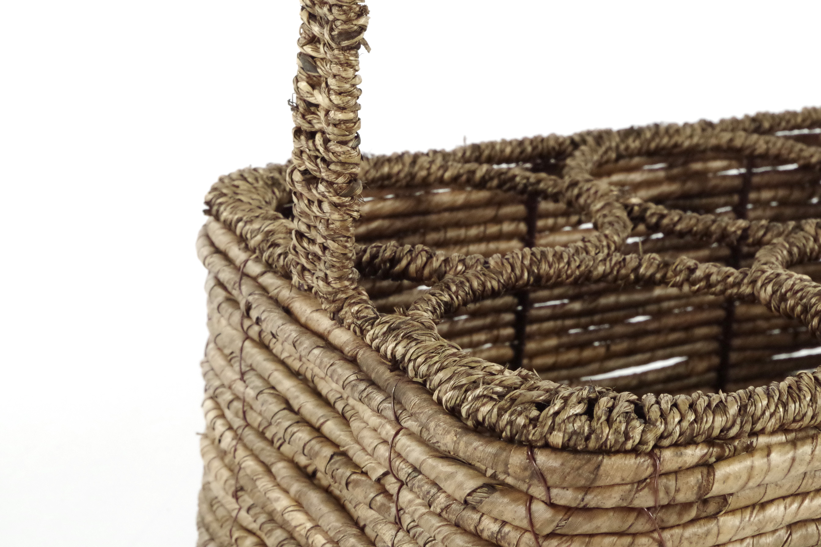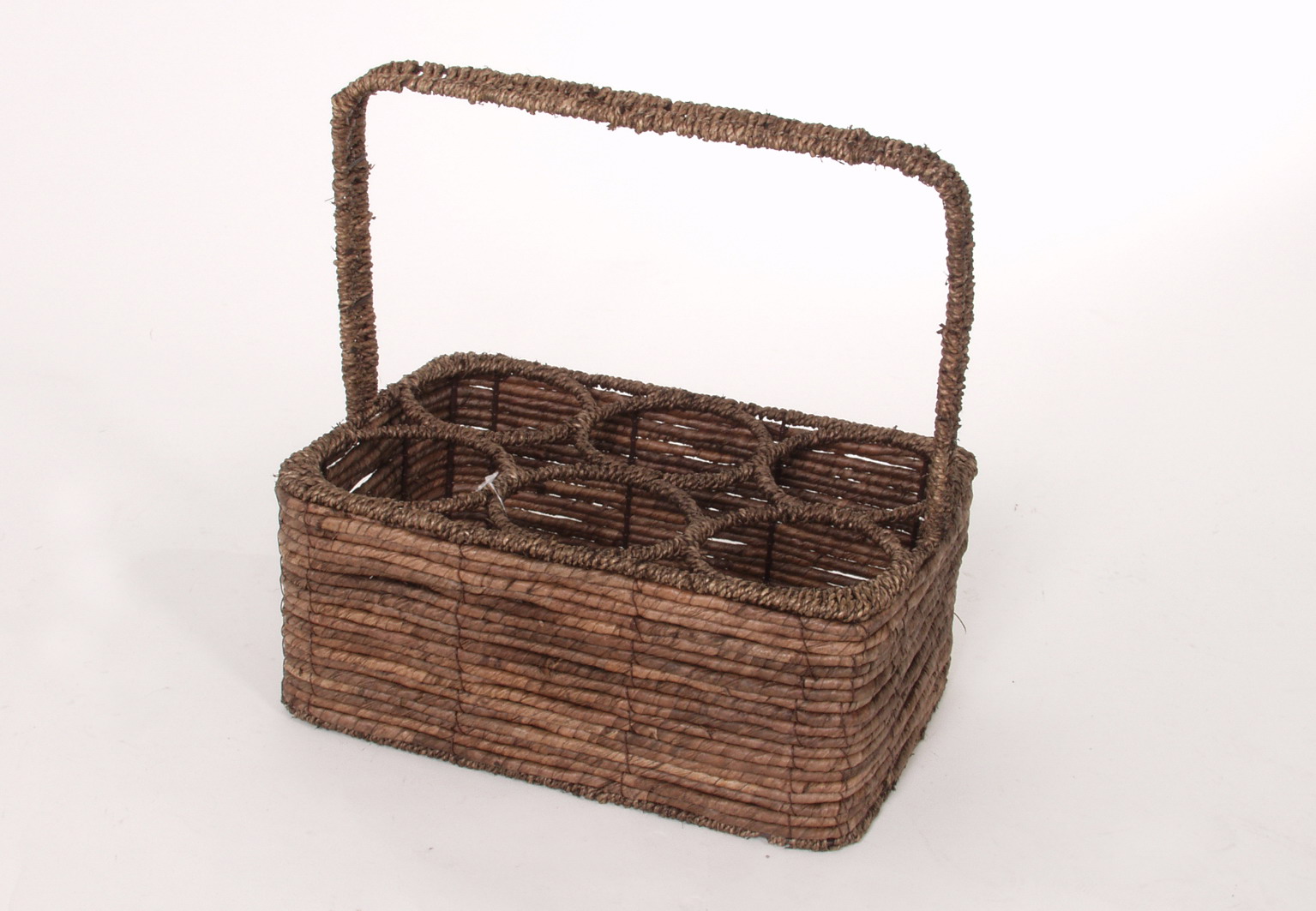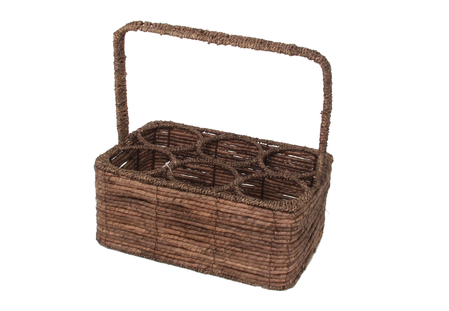 Praktischer Flaschenkorb mit Metallrahmen aus Seegras und Bananenblatt von Kobolo. Bietet Platz für 6 Flaschen. Einfach zu Tragen durch den stabilen Henkel. Länge 34cm x Breite 23cm x Höhe 14cm