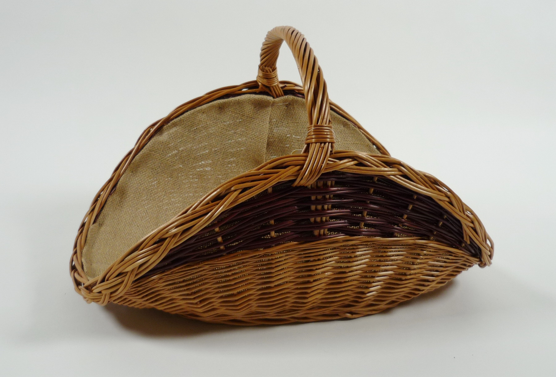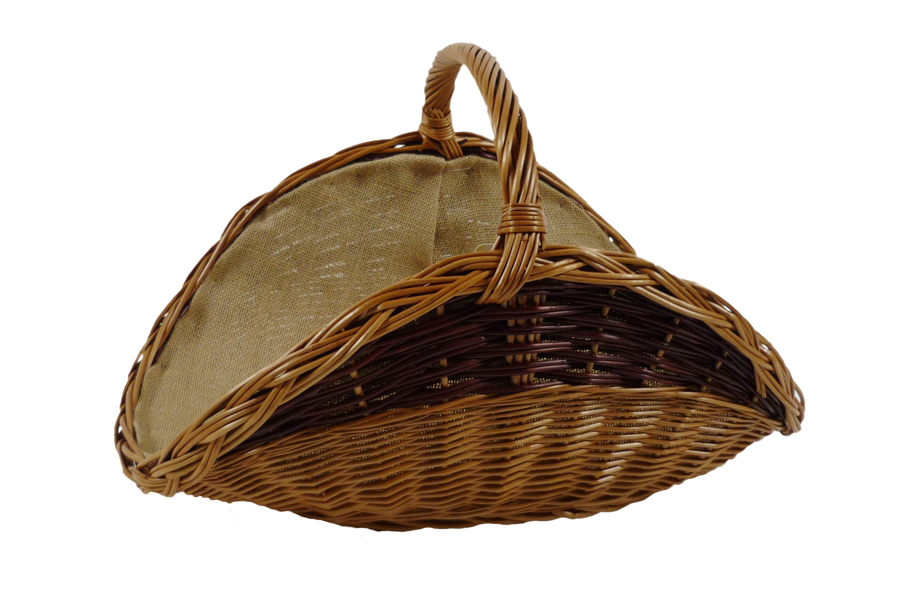 Große Ausführung einer Holzliege aus gekochter und brauner Weide, ausgeschlagen mit Sackleinen zum Schutz Ihre Wohnung vor Holzrückständen, zur Aufbewahrung von Kaminholz. Länge 67cm x Breite 43cm x Höhe 28cm