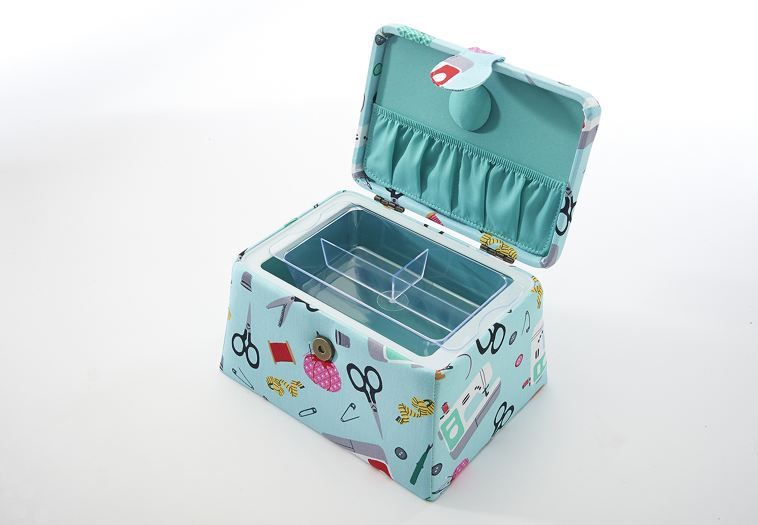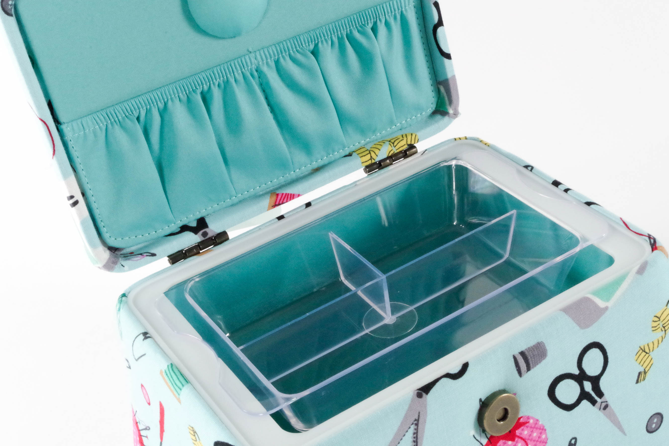 Das trapezförmige Nähkästchen von Kobolo bietet mit seinem Einsatz viel Platz für Ihre Nähutensilien und kann durch den praktischen Tragegriff aus Stoff problemlos transportiert werden. Die fröhliche Farbauswahl und das heitere Motiv werden Sie begeistern. Länge 20cm x Breite 14cm x Höhe 13cm