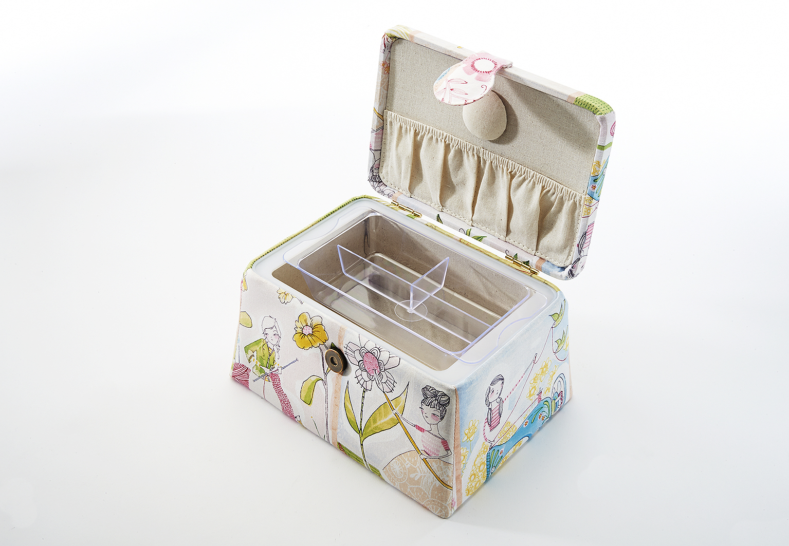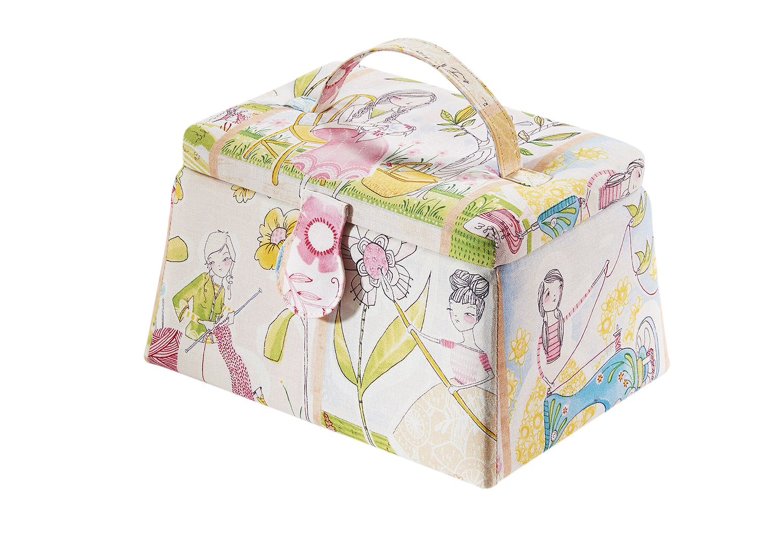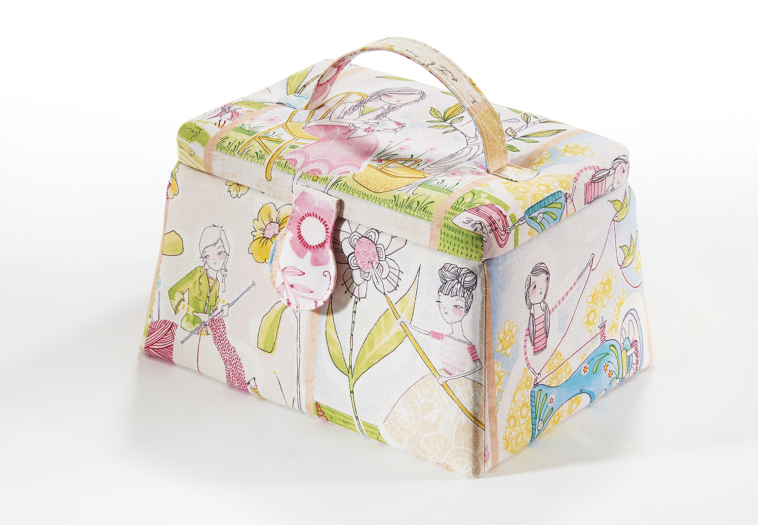 Das trapezförmige Nähkästchen von Kobolo bietet viel Platz für Ihre Nähutensilien und kann durch den praktischen und außergewöhnlichen Tragegriff aus Stoff problemlos transportiert werden. Die fröhliche Farbauswahl und das heitere Motiv werden Sie begeistern. Länge 20cm x Breite 14cm x Höhe 13cm