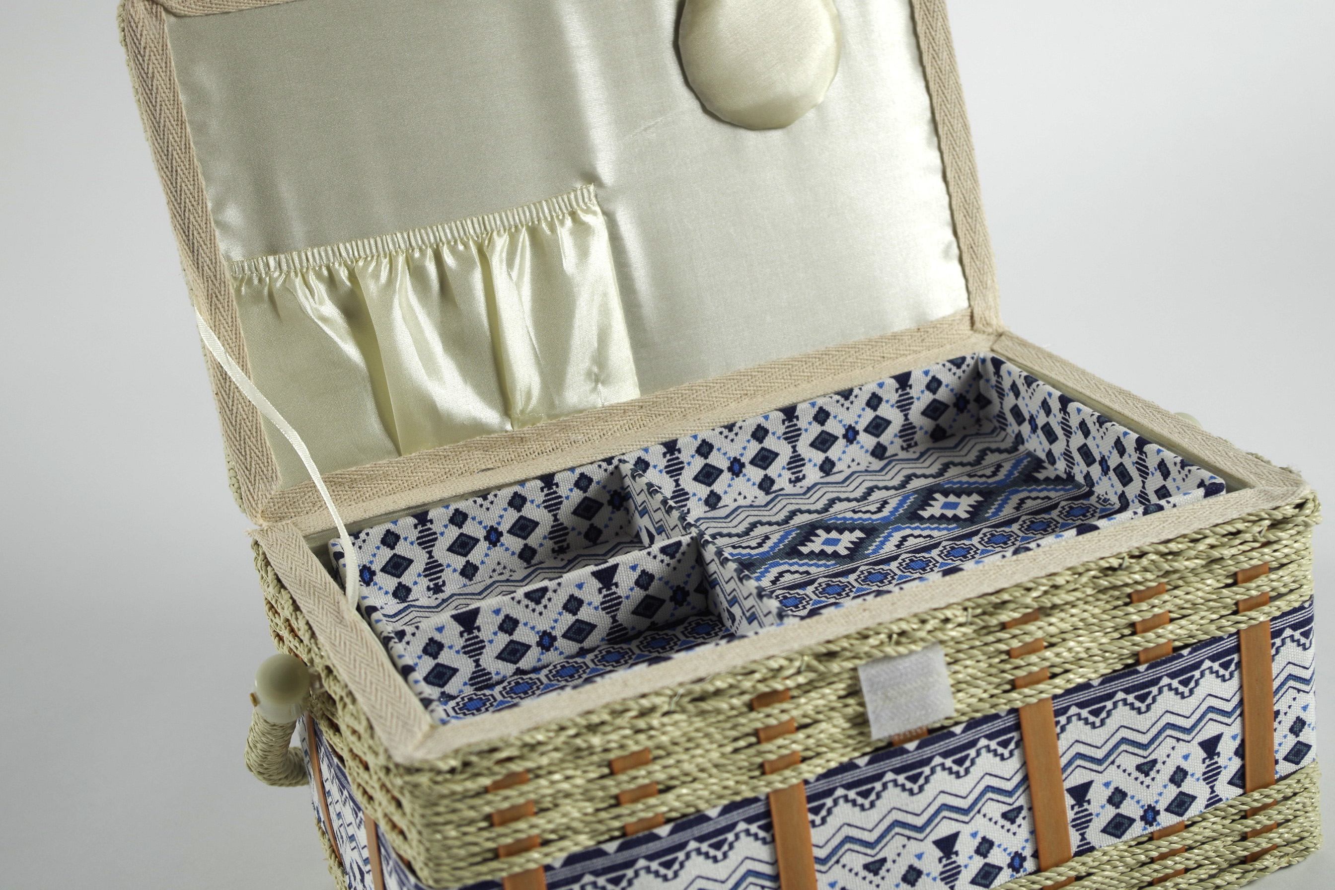Nähkästchen eckig aus Kunststoff und Textil mit blau weißem Muster