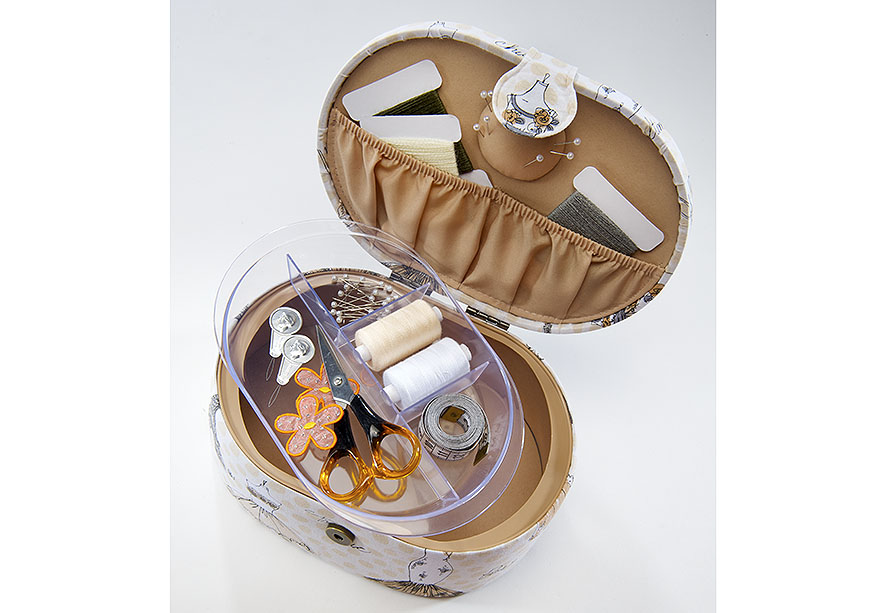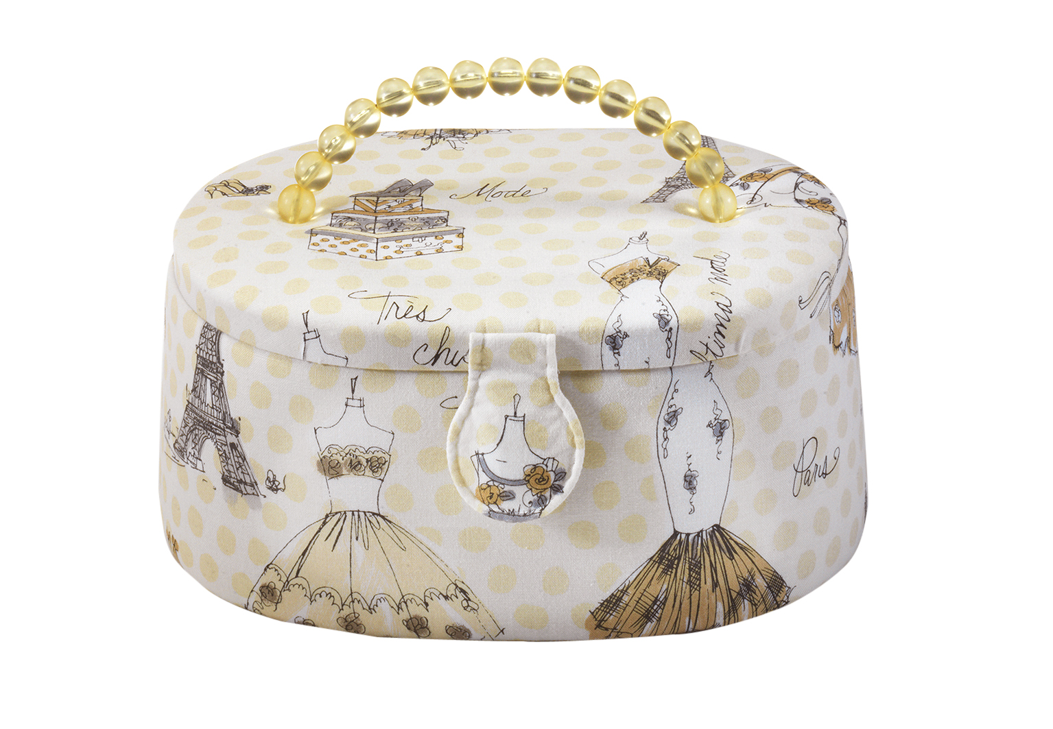 Das ovale Nähkästchen von Kobolo bietet mit seinem Einsatz viel Platz für Ihre Nähutensilien und ist so der ideale Begleiter für Ihre Näharbeiten. Die gelungene Kombination aus harmonischer Farbauswahl und elegantem Motiv beschwingt jede Näharbeit. Ein Highlight dieses Stoffnähkästchens ist der praktische Tragegriff aus bernsteinfarbenen Perlen. Länge 24cm x Breite 17cm x Höhe 10cm