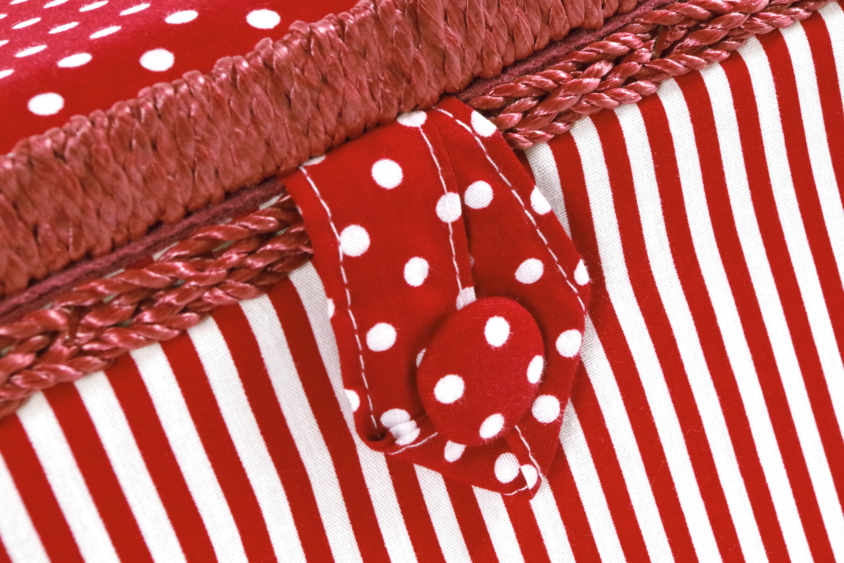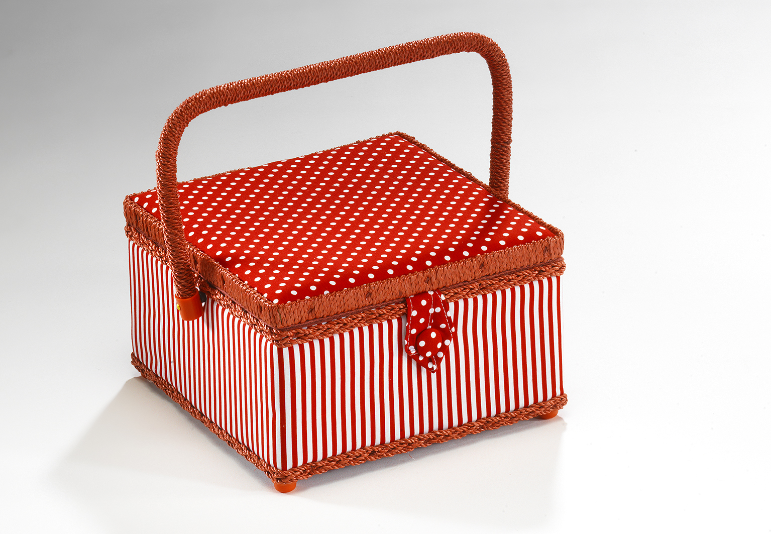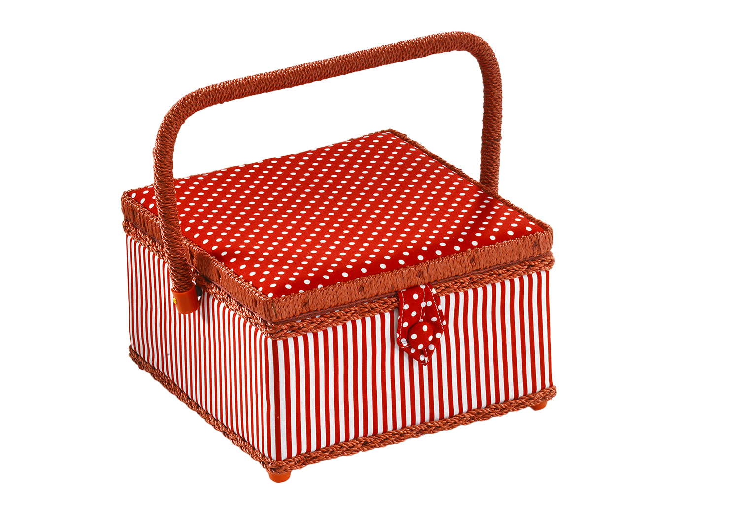 Wunderschönes, rechteckiges Nähkästchen von Kobolo. Im Inneren mit flachem, herausnehmbarem Organisationseinsatz aus Textil, für verschiedene Kleinteile ausgestattet. Dieses Nähkästchen ist in rot/weiß gehalten und besitzt einen schwenkbaren Tragegriff. Länge 23cm x Breite 23cm x Höhe 14cm