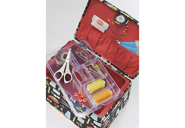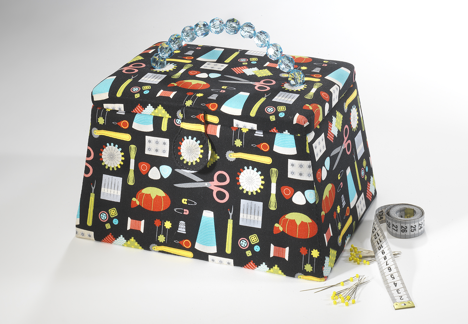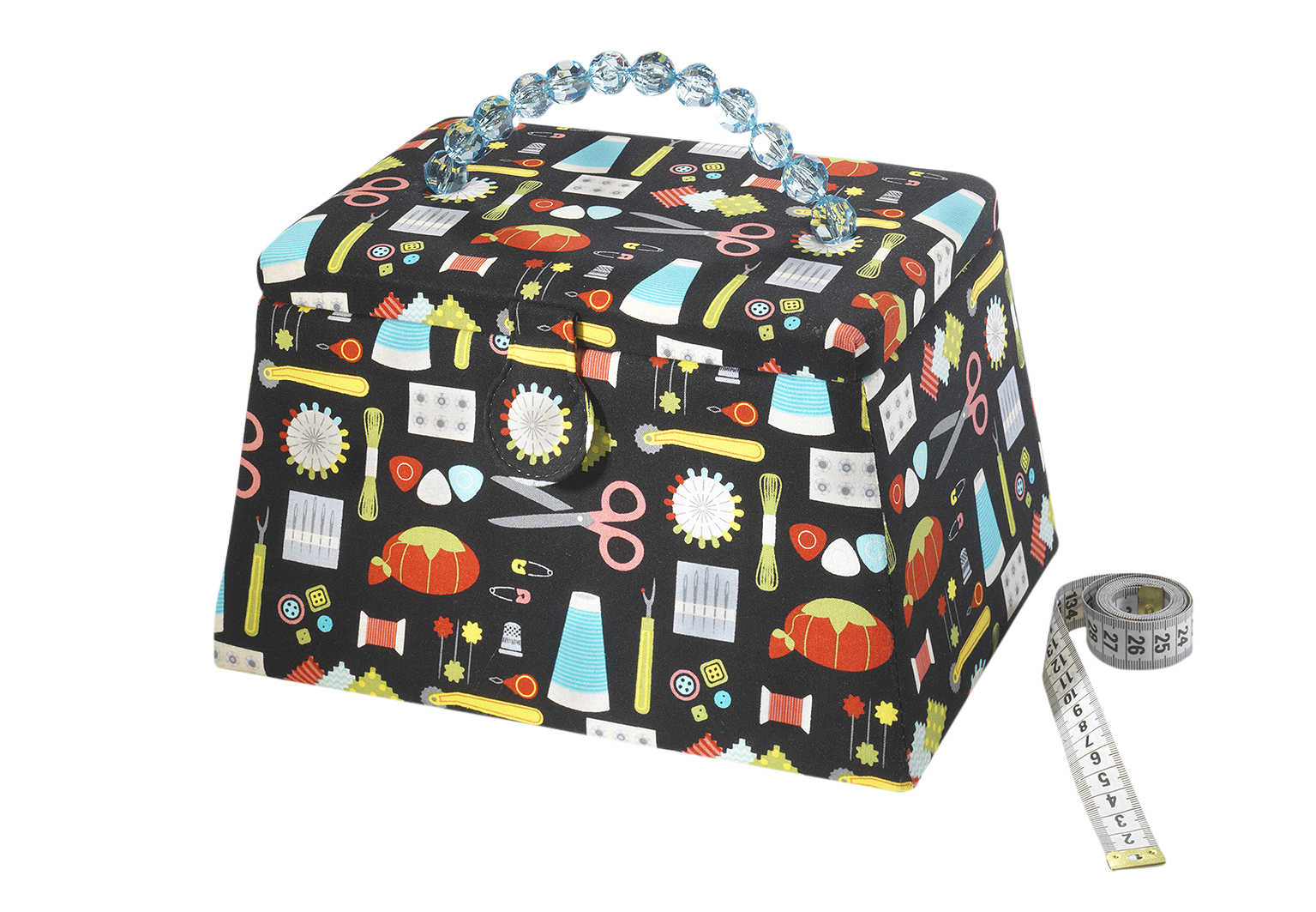 Das trapezförmige Nähkästchen von Kobolo ist eine gelungene Kombination aus Funktionalität und Design. Mit seinem Einsatz bietet das Stoffnähkästchen viel Platz für Ihre Nähutensilien und beschwingt durch die ansprechende Farbauswahl jede Näharbeit. Ein Highlight dieses Nähkorbes ist der praktische Tragegriff aus blauen Perlen. Länge 28cm x Breite 20cm x Höhe 16cm