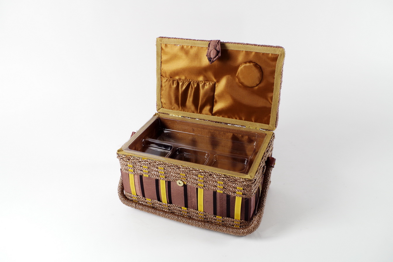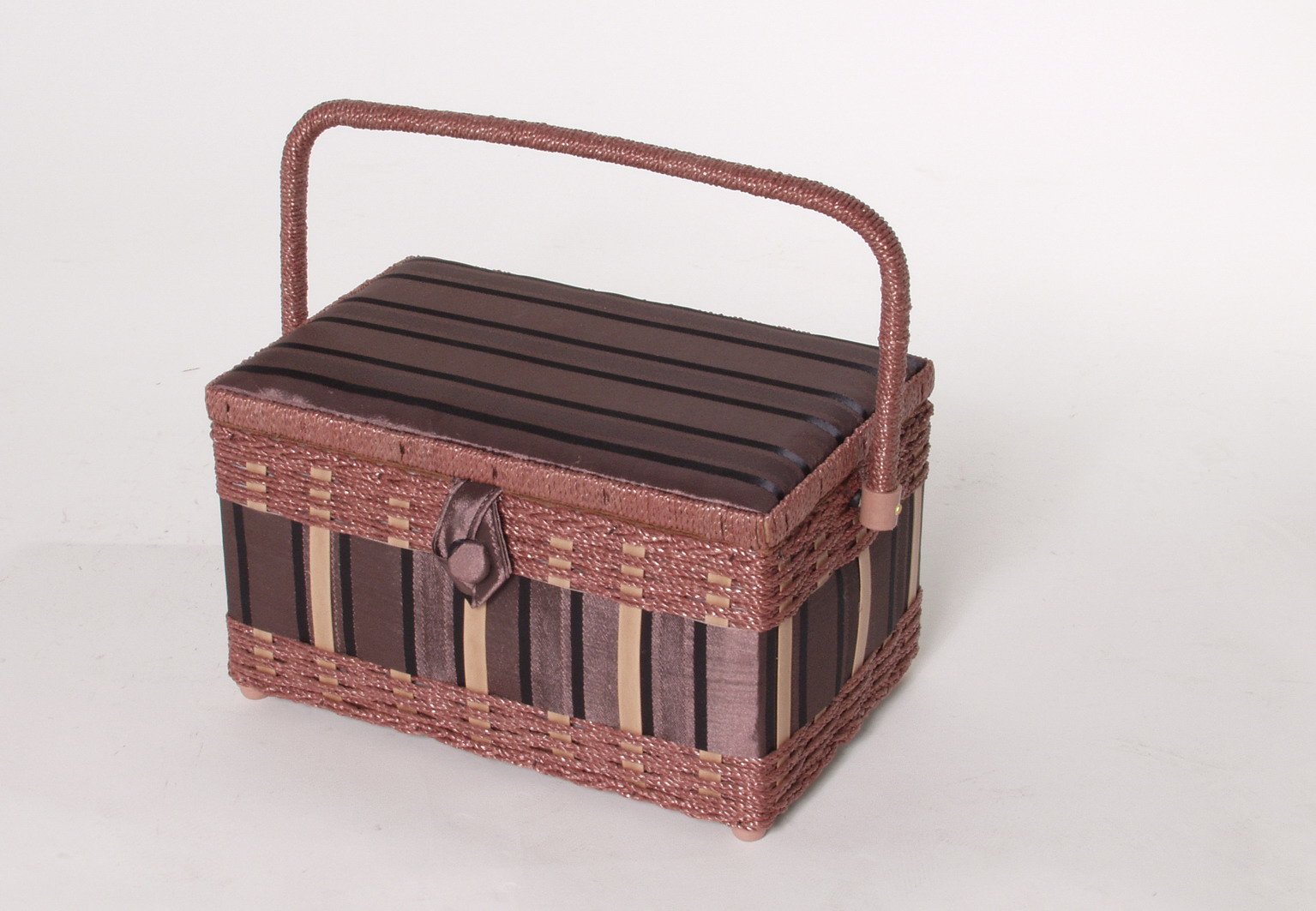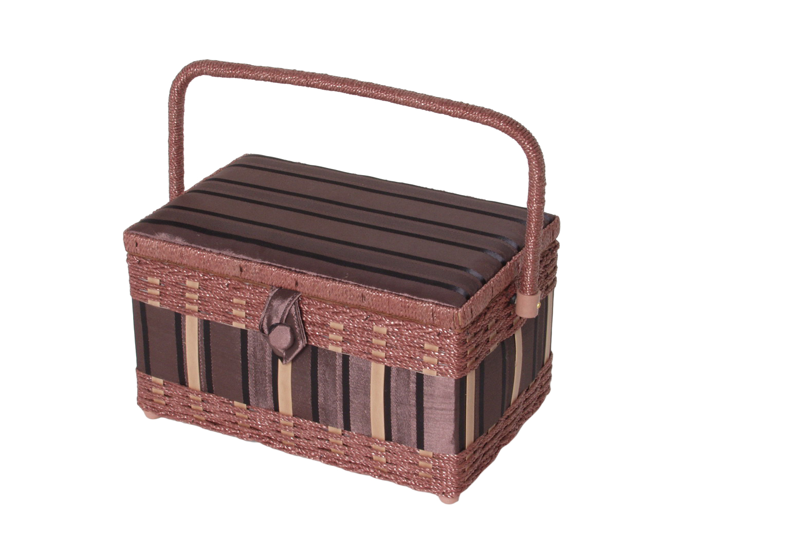 Wunderschöner, rechteckiger Nähkorb, im Inneren mit flachem, herausnehmbarem Organisationseinsatz aus Kunstoff, für verschiedene Kleinteile. Dieser Nähkorb ist in einem aparten braun gehalten und besitzt einen schwenkbaren Tragegriff. Innen ist der Korb mit einem farblich abgestimmtem Stoff in braun ausgeschlagen. Länge 28cm x Breite 18cm x Höhe 16cm