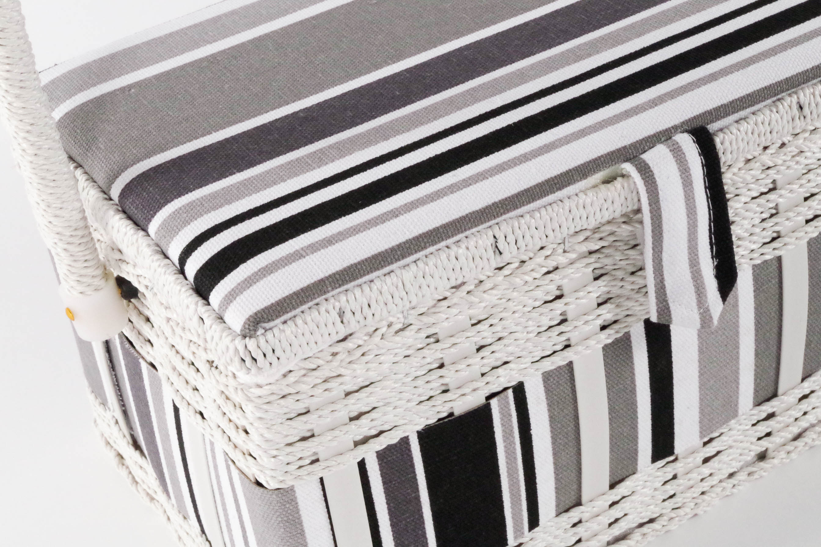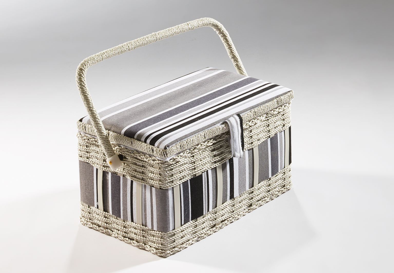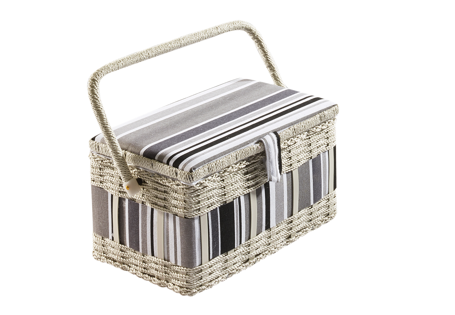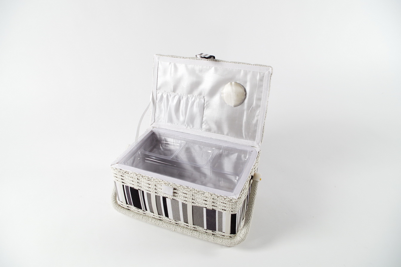 Wunderschöner, rechteckiger Nähkorb von Kobolo. Im Inneren mit flachem, herausnehmbarem Organisationseinsatz aus Kunstoff, für verschiedene Kleinteile. Dieser Nähkorb ist in einem aparten grau/weiß gehalten und besitzt einen schwenkbaren Tragegriff. Länge 28cm x Breite 19cm x Höhe 17cm