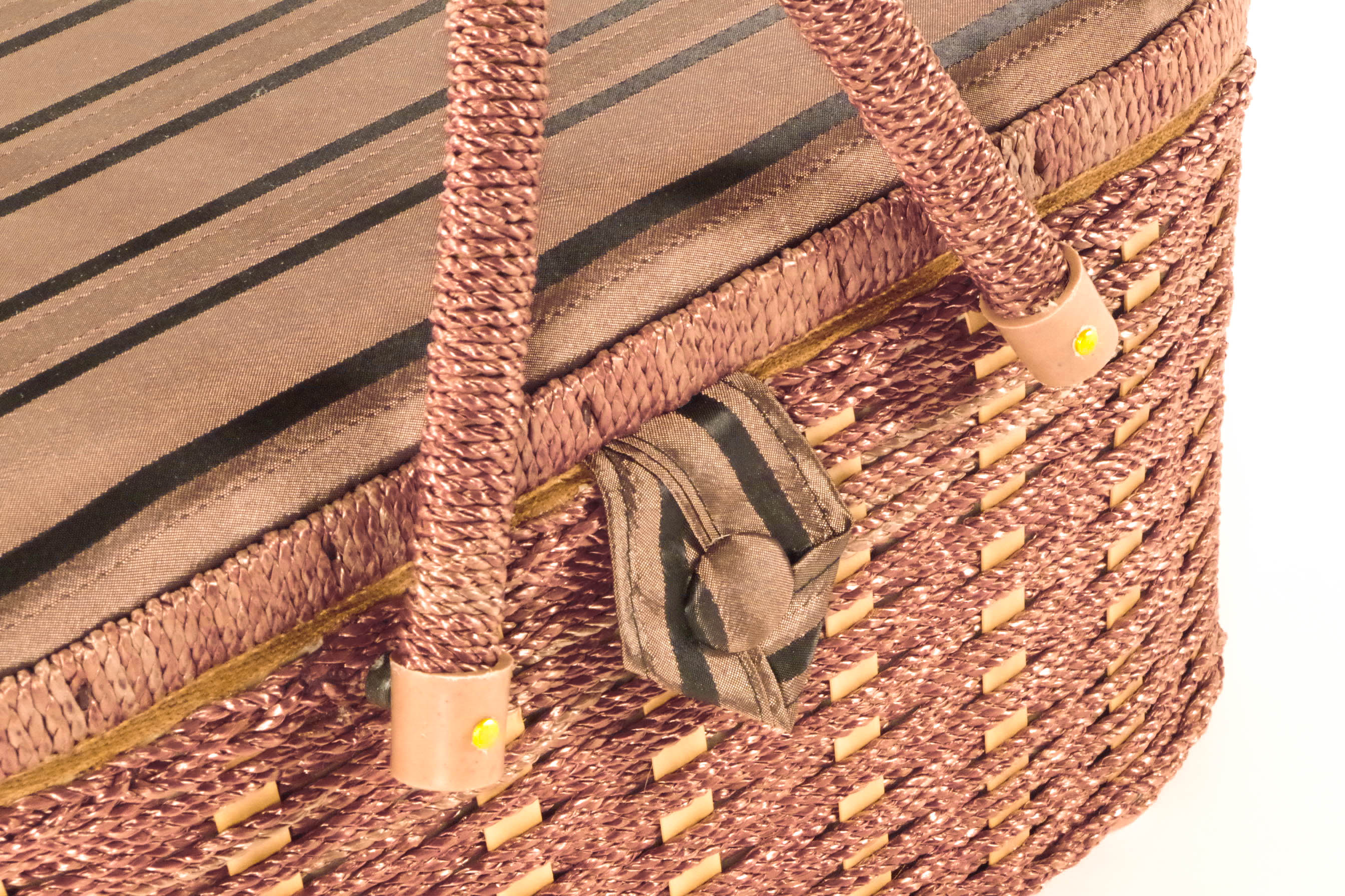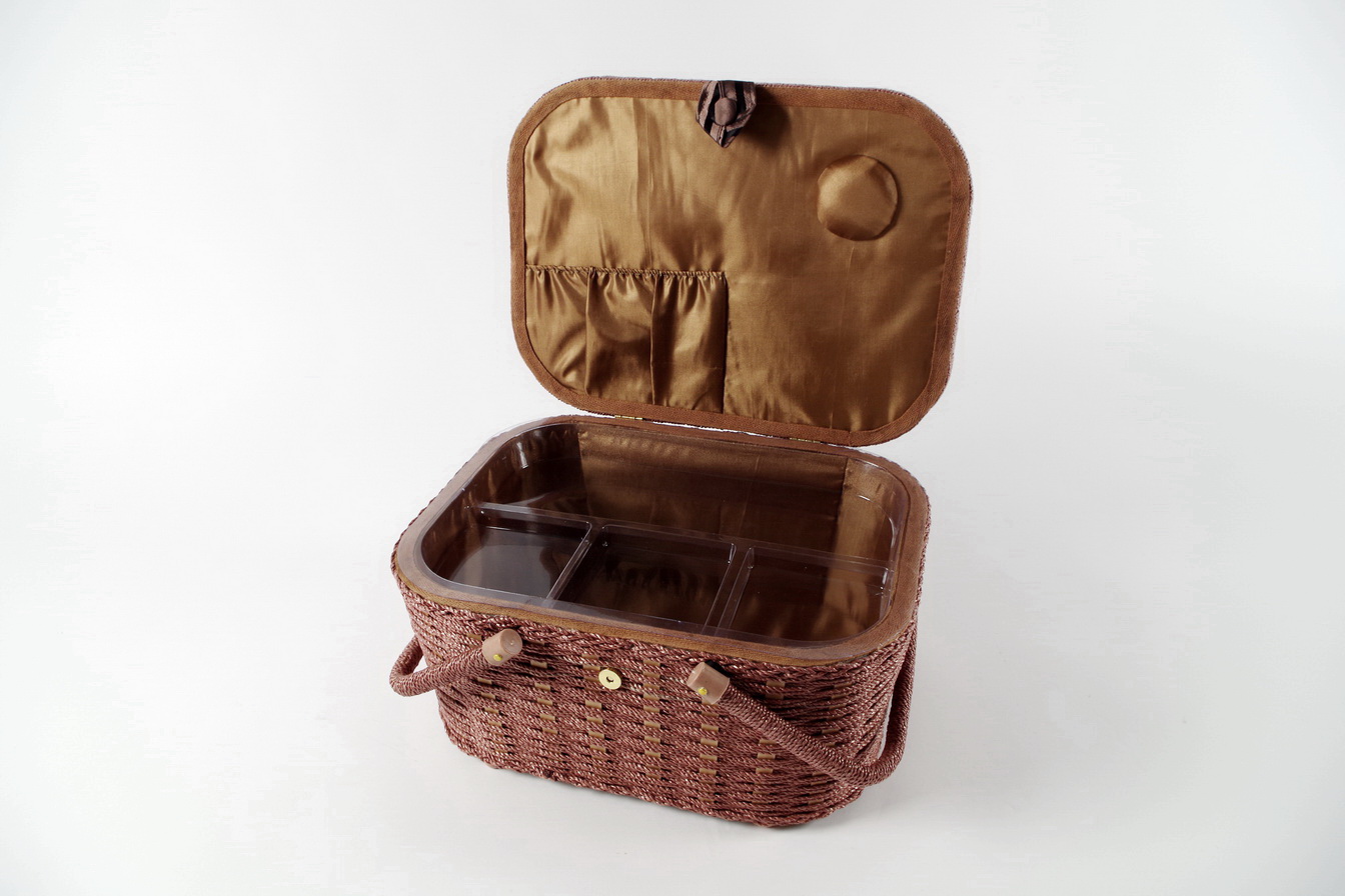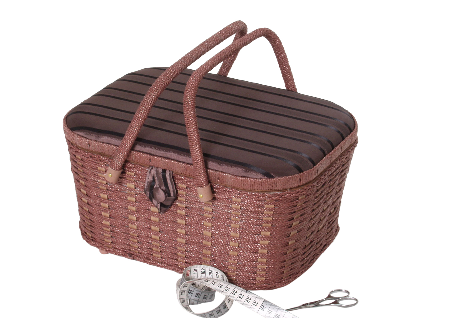 Wunderschöner Nähkorb mit Doppelhenkeln und herausnehmbarem Kunststoffeinsatz im Inneren für verschiedene Kleinteile. Dieser Nähkorb ist in einem aparten Braun gehalten und besitzt abgerundete Ecken. Innen ist der Korb weiterhin in einem passenden Stoff ausgeschlagen. Die beiden Griffe können seitlich heruntergeklappt werden. Länge 35cm x Breite 27cm x Höhe 17cm