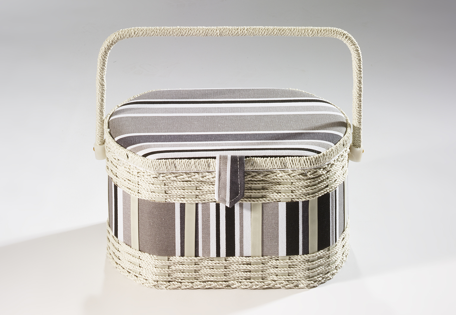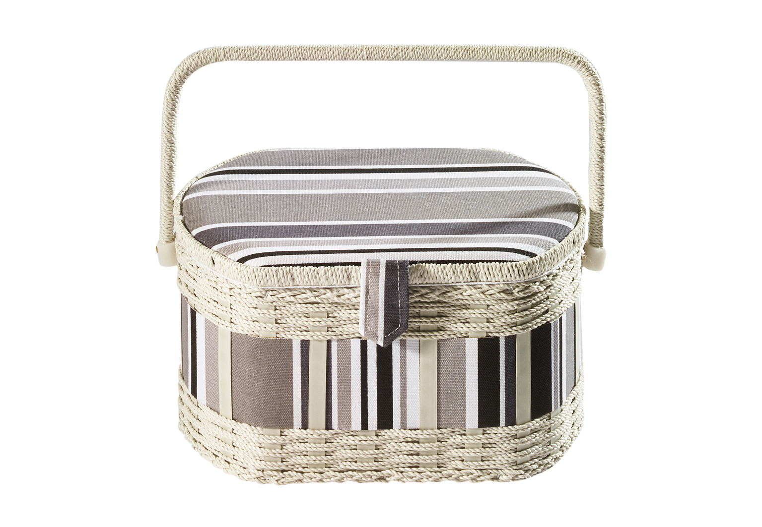 Wunderschöner ovaler Nähkorb im modernen Stoffdesign von Kobolo. Im Inneren befindet sich ein flacher, herausnehmbarem Organisationseinsatz für verschiedene Kleinteile. Der Tragegriff kann zurück geklappt werden. Länge 27cm x Breite 19cm x Höhe 16cm
