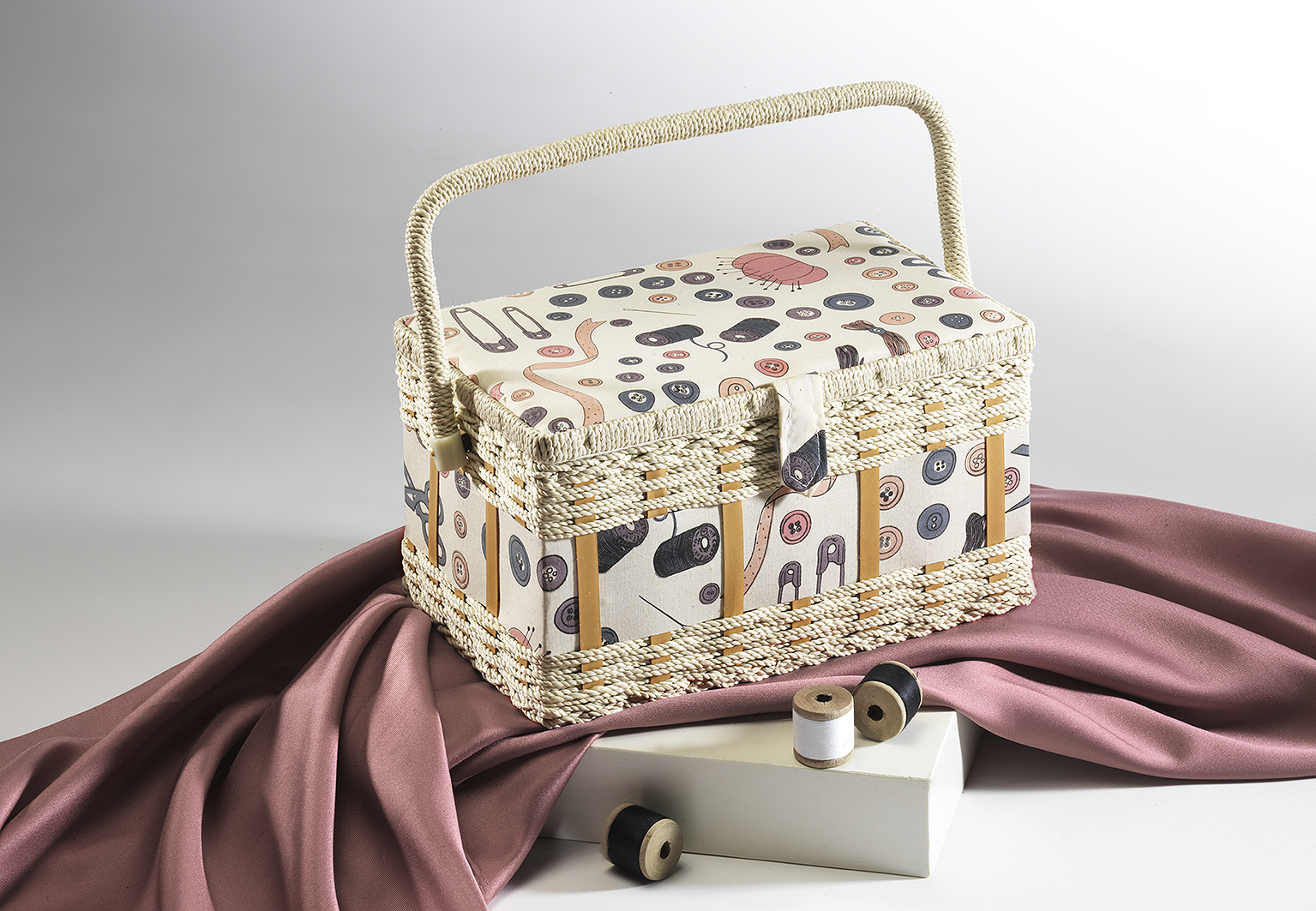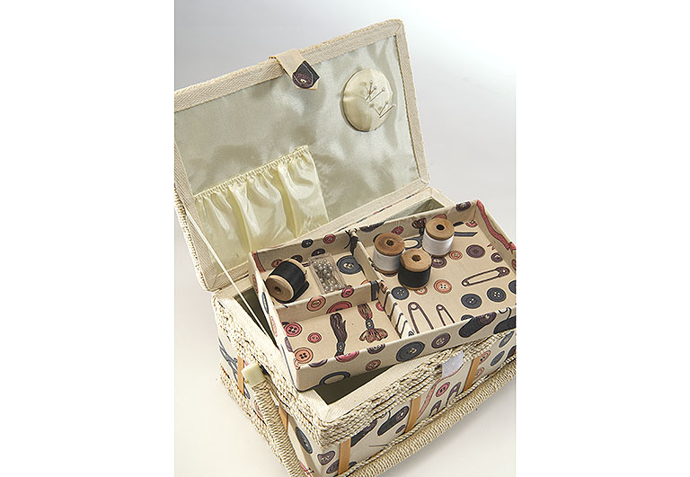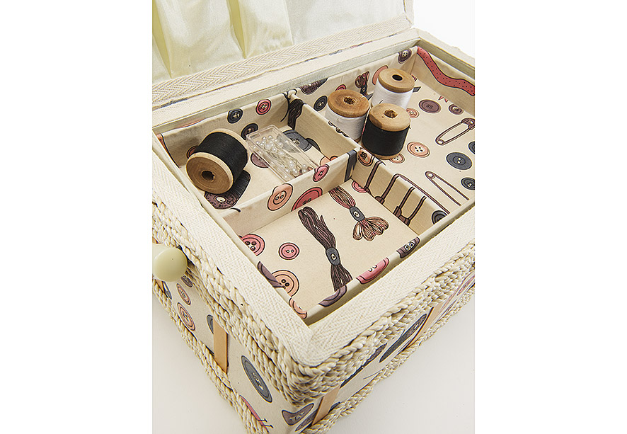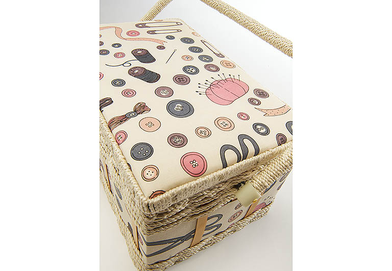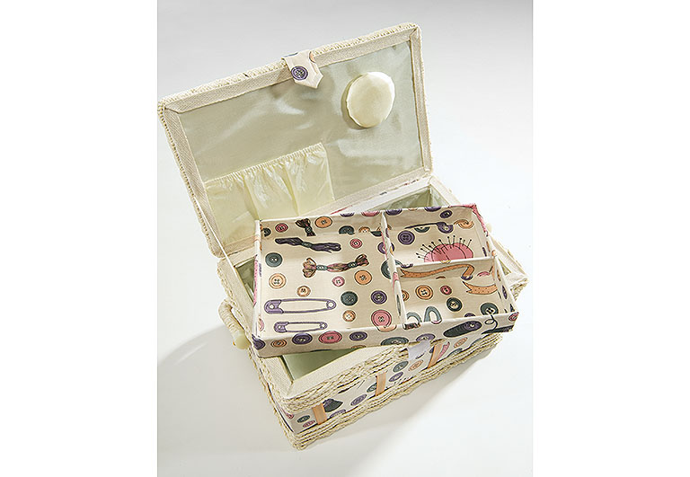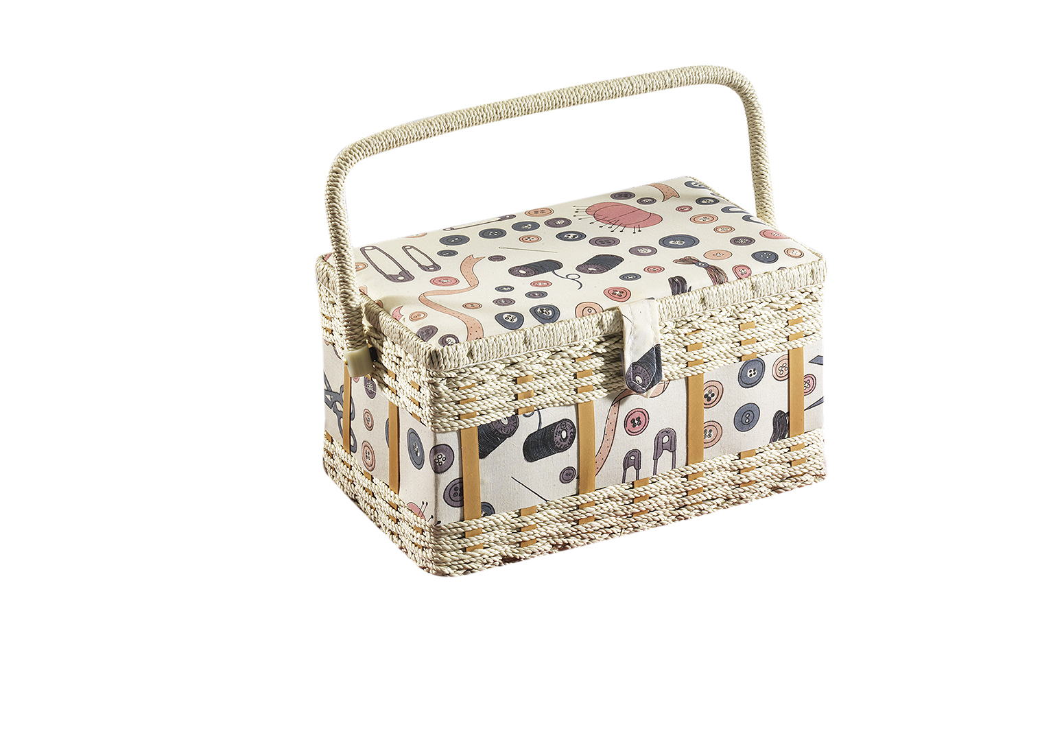 Wunderschöner, rechteckiger Nähkorb von Kobolo. Im Inneren mit flachem, herausnehmbarem Organisationseinsatz aus Textil, für verschiedene Kleinteile ausgestattet. Ein verspieltes Knopfmuster gibt diesem Nähkorb den letzten Schliff. Länge 28cm x Breite 18cm x Höhe 16cm