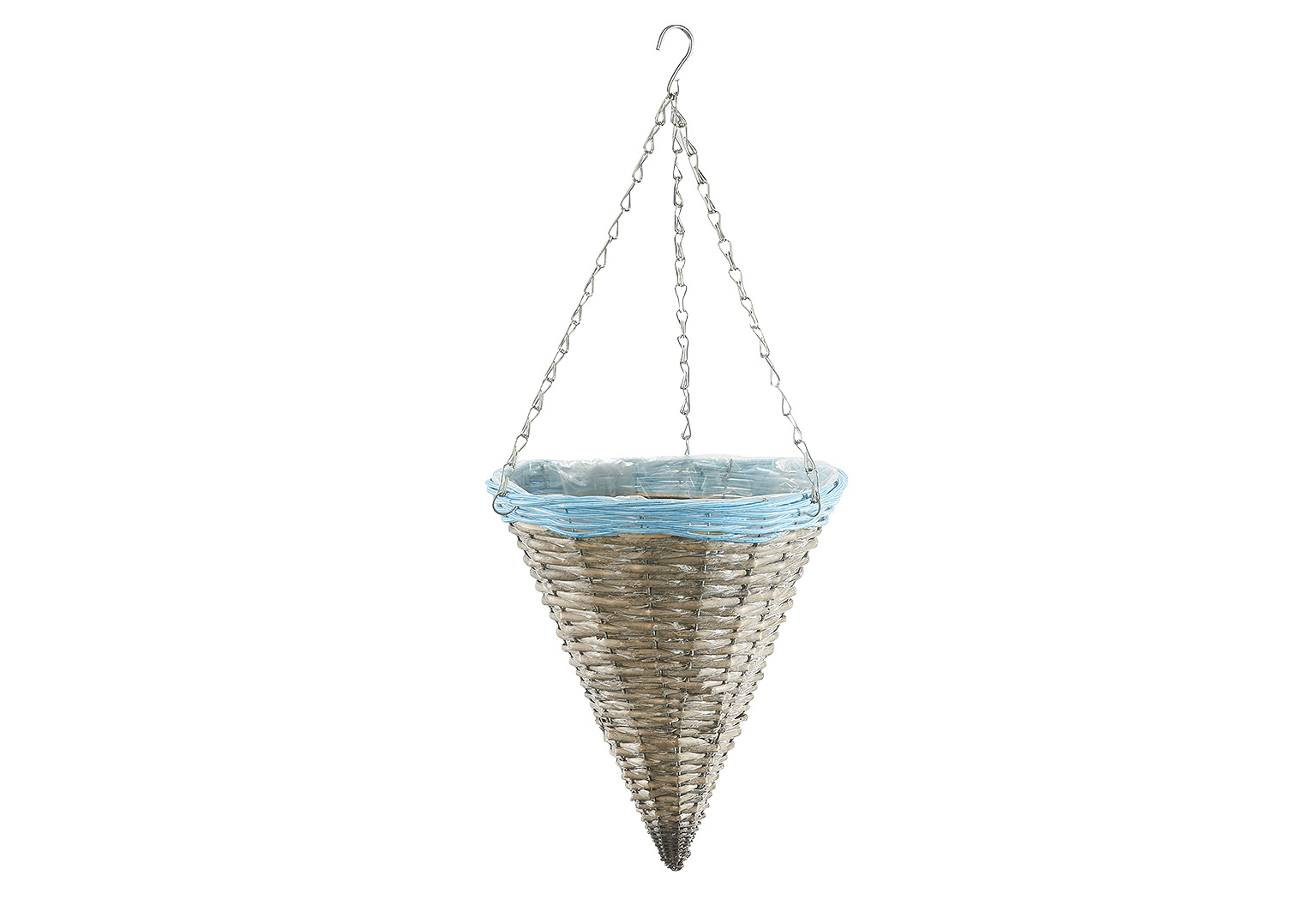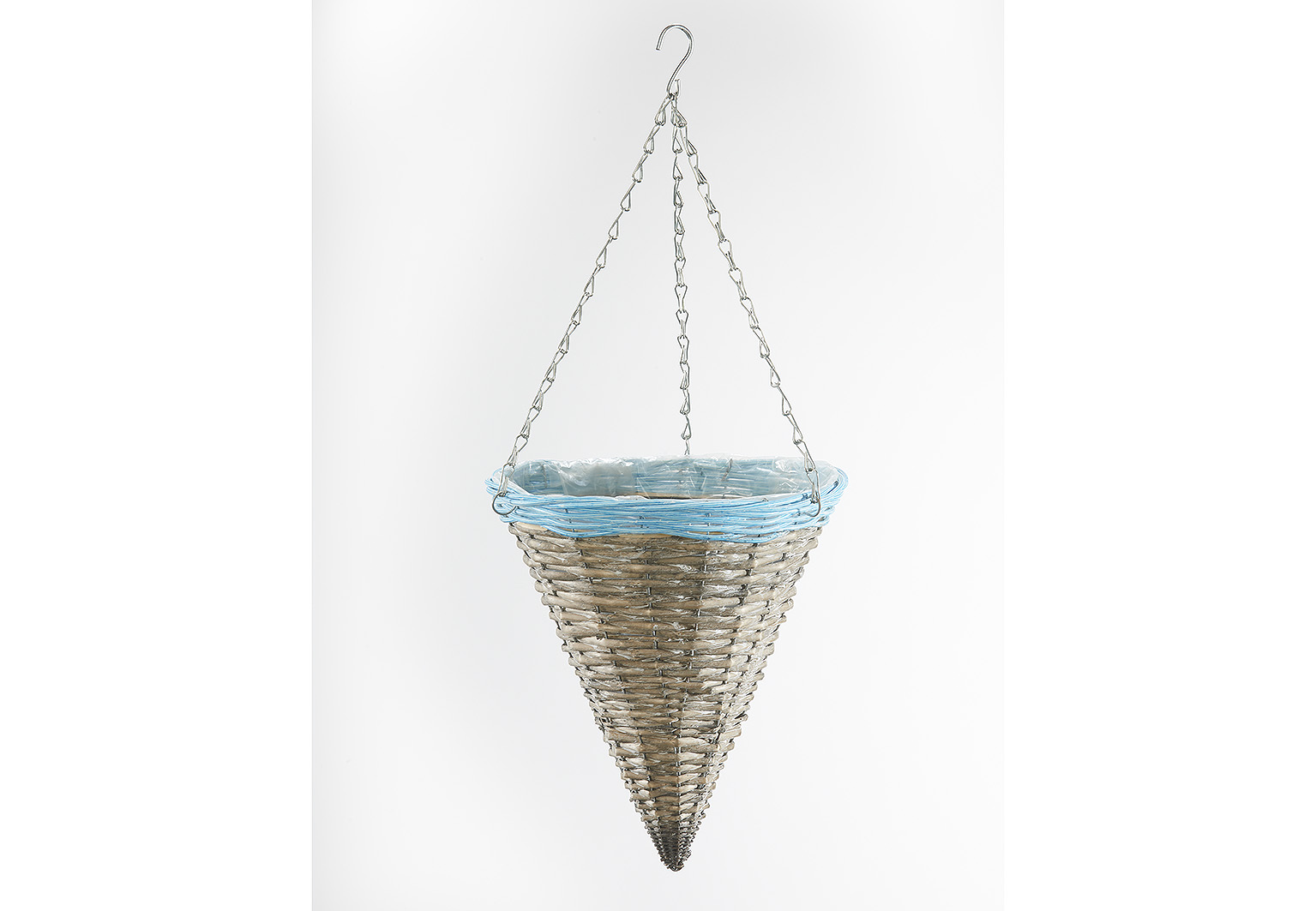 Blumenampel spitz rund aus Weide grau Rand Polyrattan blau mit Folie