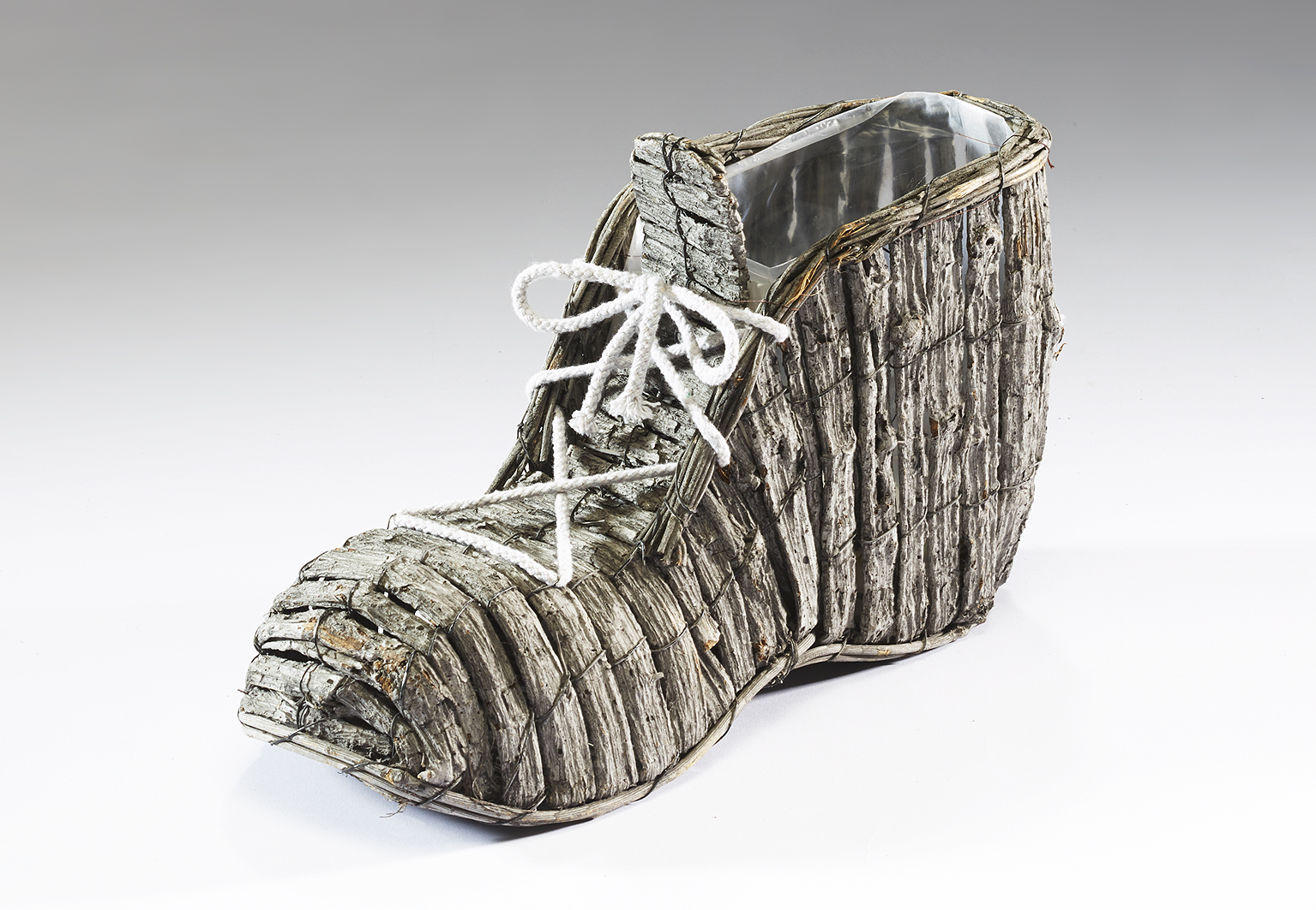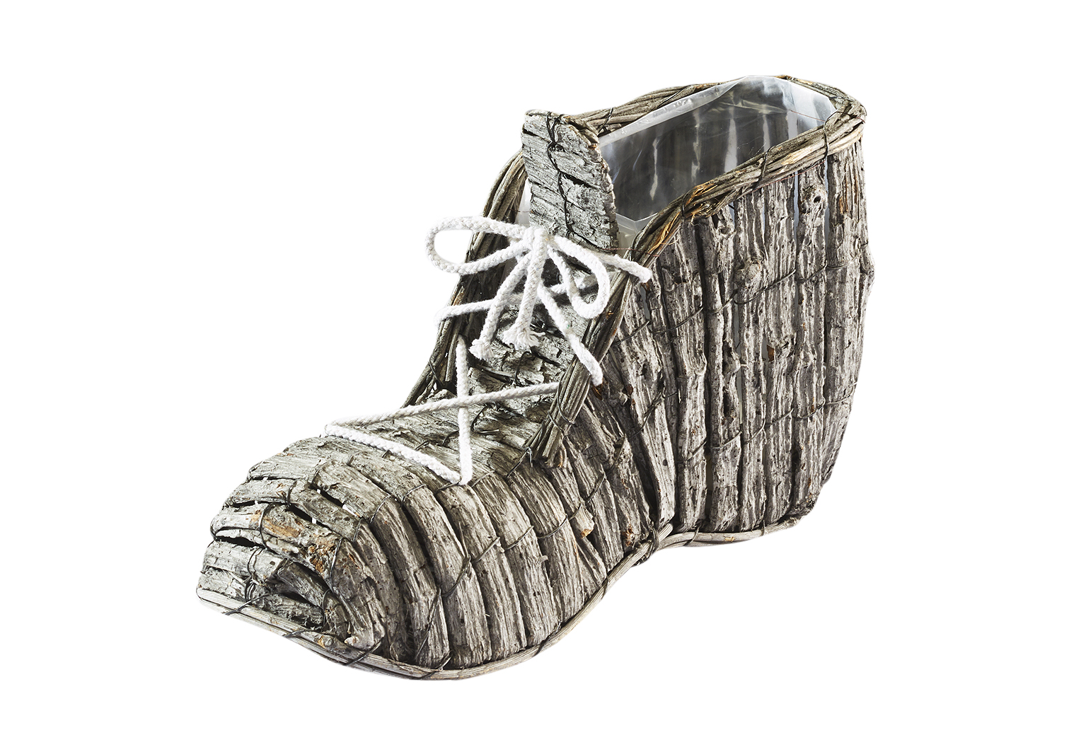 Deko-Schuh bepflanzbar aus grauer Rinde mit Folie ausgeschlagen 35 cm