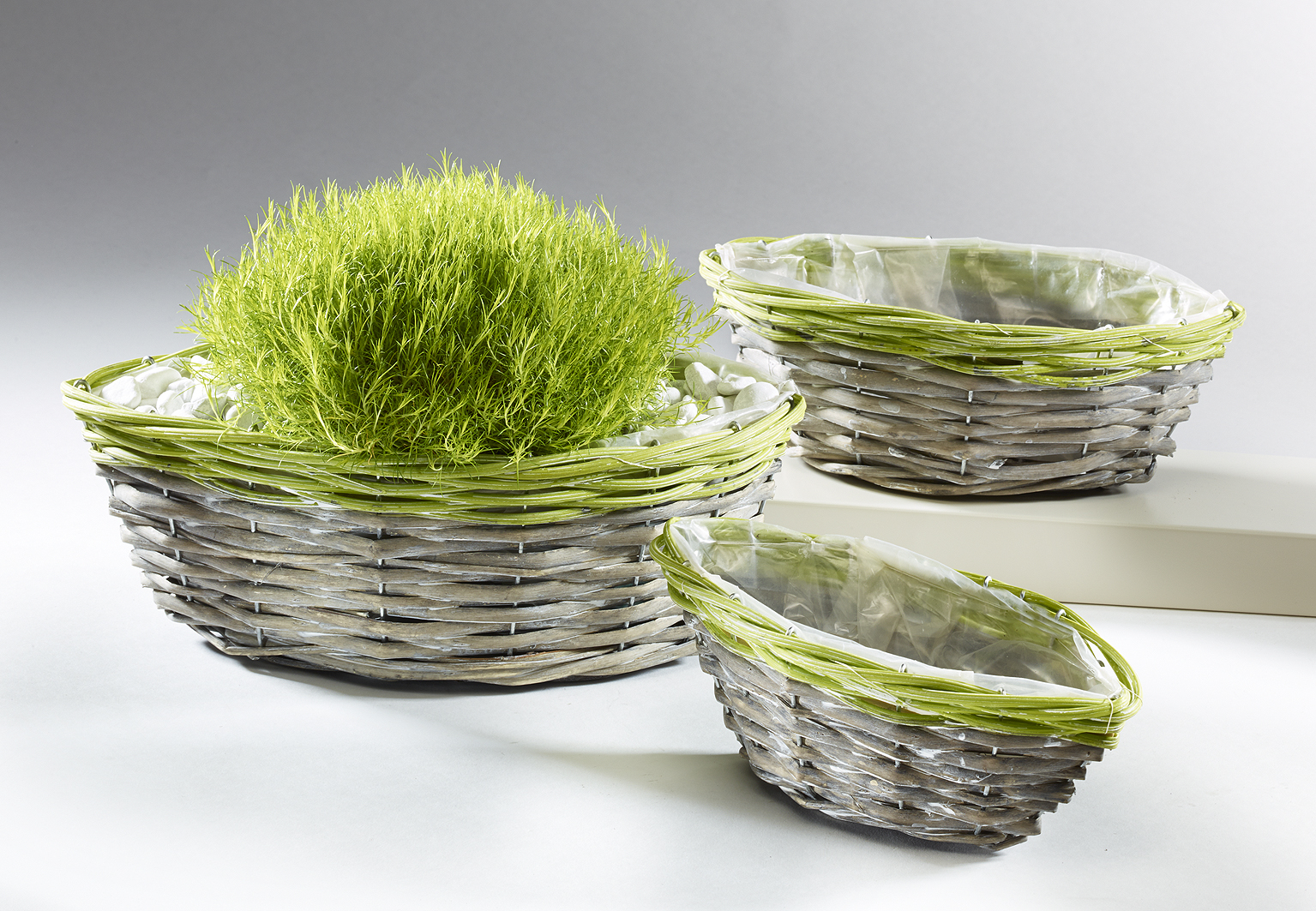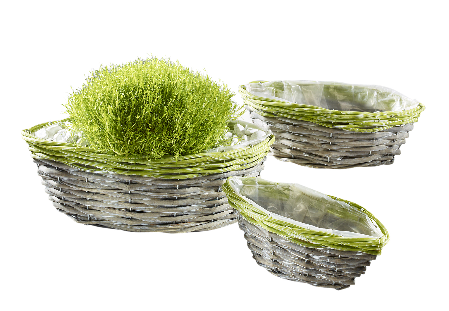 Dekoratives Pflanzkorb-3er Set grau aus Weide von Kobolo. Die Körbe sind mit Folie ausgeschlagen und lassen sich wunderbar bepflanzen. Der grüne Rand aus Polyrattan verleiht den Körben einen frischen Touch. Mit Blumen bepflanzt auch als Geschenk zum Beispiel zu Ostern, zum Geburtstag oder Muttertag ein echter Hingucker. Maße Ca.Gr1 24cm x 13cm x 8 cm , Gr2 27cm x 15cm x 9 cm , Gr3 31cm x 17cm x 10cm