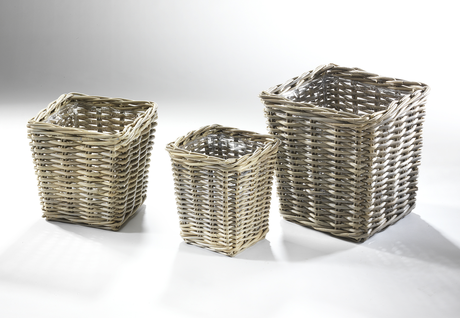 Die eckigen Rattanübertöpfe im 3er Set von Kobolo sind aus natürlichem Kubu-Rattan in einem zeitlosen Grauton gefertigt. Praktisch mit Folie ausgeschlagen, eignen sich die Rattankörbe perfekt zum Bepflanzen. Das natürliche Farbenspiel des Materials macht den Reiz dieser in aufwendiger Handarbeit gefertigten Übertöpfe aus. Rattan ist aufgrund seiner natürlichen Beschaffenheit noch immer ein sehr beliebter Werkstoff zur Herstellung von Korbwaren und durch seine hohe Belastbarkeit bietet es Eigenschaften, die denen vieler anderer Materialien überlegen sind. Maße Ca.Gr1 24cm x 24cm x 26cm , Gr2 30cm x 30cm x 29cm , Gr3 39cm x 39cm x 36cm