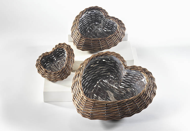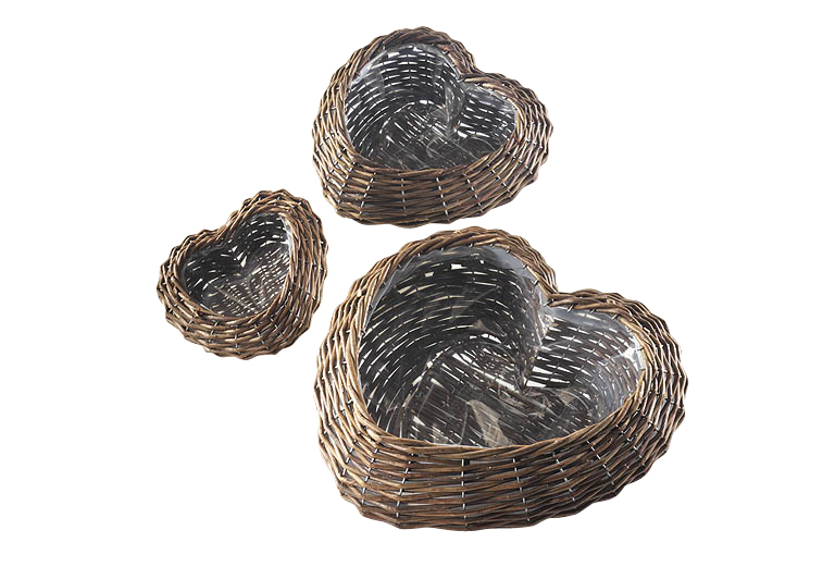 Die herzförmigen Pflanzschalen im 3er Set von Kobolo sind aus natürlicher Weide in einem zeitlosen Braunton gefertigt. Praktisch mit Folie ausgeschlagen, eignen sich die Weidenschalen perfekt zum Bepflanzen. Das natürliche Farbenspiel des Materials macht den Reiz dieser in aufwendiger Handarbeit gefertigten Pflanzgefäße aus. Mit Blumen bepflanzt auch als Geschenk zum Beispiel zu Ostern, zum Geburtstag oder Muttertag ein echter Hingucker. Maße Ca.Gr1 18cm x 18cm x 7 cm , Gr2 25cm x 25cm x 10cm , Gr3 35cm x 35cm x 12cm