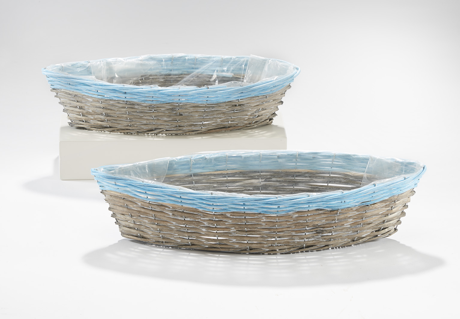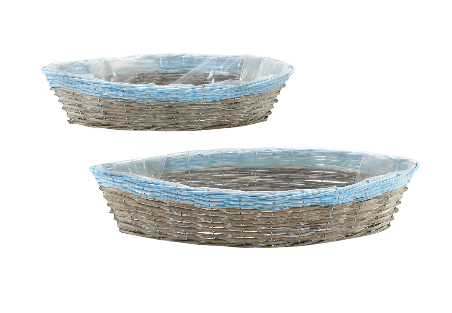 Dekoratives Pflanzkorb 2er Set grau aus Weide von Kobolo. Die Körbe sind mit Folie ausgeschlagen und lassen sich wunderbar bepflanzen. Der blaue Rand aus Polyrattan verleiht den Körben einen frischen Touch. Mit Blumen bepflanzt auch als Geschenk zum Beispiel zu Ostern, zum Geburtstag oder Muttertag ein echter Hingucker. Maße Ca.Gr1 45cm x 18cm x 11cm , Gr2 54cm x 16cm x 13cm
