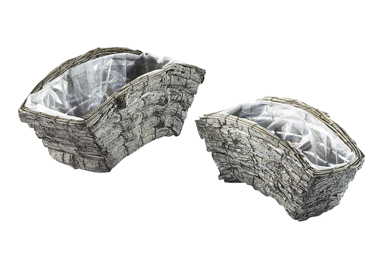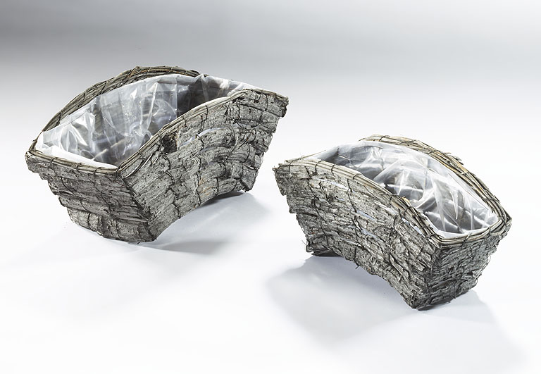Tolles Pflanzschalenset aus Rinde von Kobolo. Praktisch mit Folie ausgeschlagen, eignen sich die Rindenkörbe perfekt zum Bepflanzen. Das natürliche Farbenspiel des Materials macht den Reiz dieser in aufwendiger Handarbeit gefertigten Übertöpfe aus. Mit Blumen bepflanzt auch als Geschenk zum Beispiel zu Ostern, zum Geburtstag oder Muttertag ein echter Hingucker. Maße Ca.Gr1 27cm x 11cm x 13cm , Gr2 30cm x 14cm x 14cm