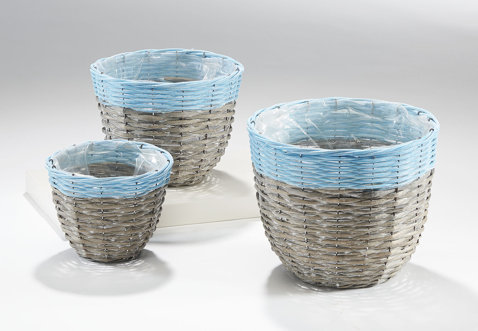 Schönes Übertopfset aus Weide und Polyrattan von Kobolo. Fügt sich aufgrund seiner Farbgebung perfekt in sämtliche Einrichtungsstile ein. Die Übertöpfe sind mit Folie ausgeschlagen, das ermöglicht ein sauberes Bepflanzen. Mit Blumen bepflanzt sind diese Übertöpfe auch eine pfiffige Geschenkidee zum Beispiel zum Geburtstag, Muttertag oder Ostern. Maße Ca.Gr1 Ø19cm x Höhe 15cm , Gr2 Ø24cm x Höhe 19cm , Gr3 Ø28cm x Höhe 23cm