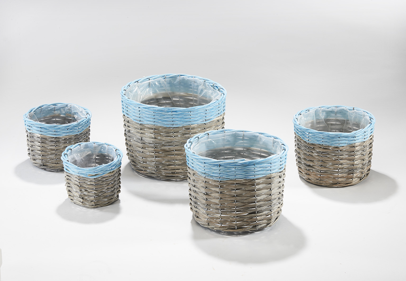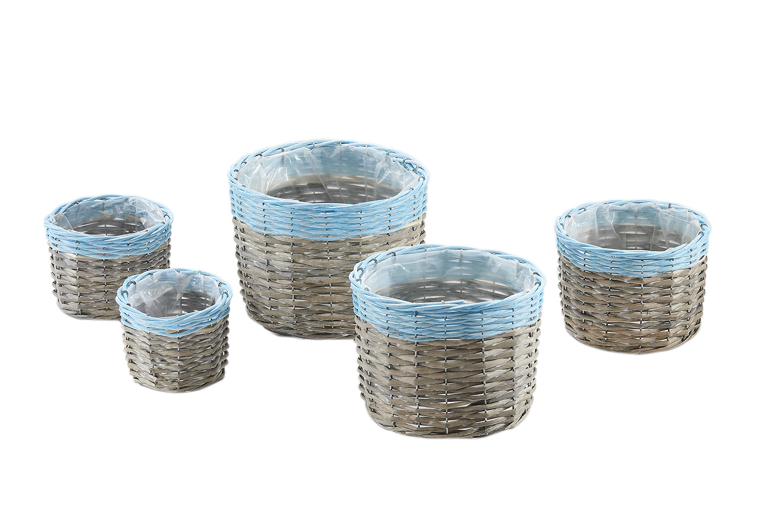 Schönes Übertopfset aus Weide und Polyrattan von Kobolo. Fügt sich aufgrund seiner Farbgebung perfekt in sämtliche Einrichtungsstile ein. Die Übertöpfe sind mit Folie ausgeschlagen, das ermöglicht ein sauberes Bepflanzen. Mit Blumen bepflanzt sind diese Übertöpfe auch eine pfiffige Geschenkidee zum Beispiel zum Geburtstag, Muttertag oder Ostern. Maße Ca.Gr1 Ø14cm x Höhe 11cm , Gr2 Ø17cm x Höhe 13cm , Gr3 Ø21cm x Höhe 15cm , Gr4 Ø23cm x Höhe 18cm