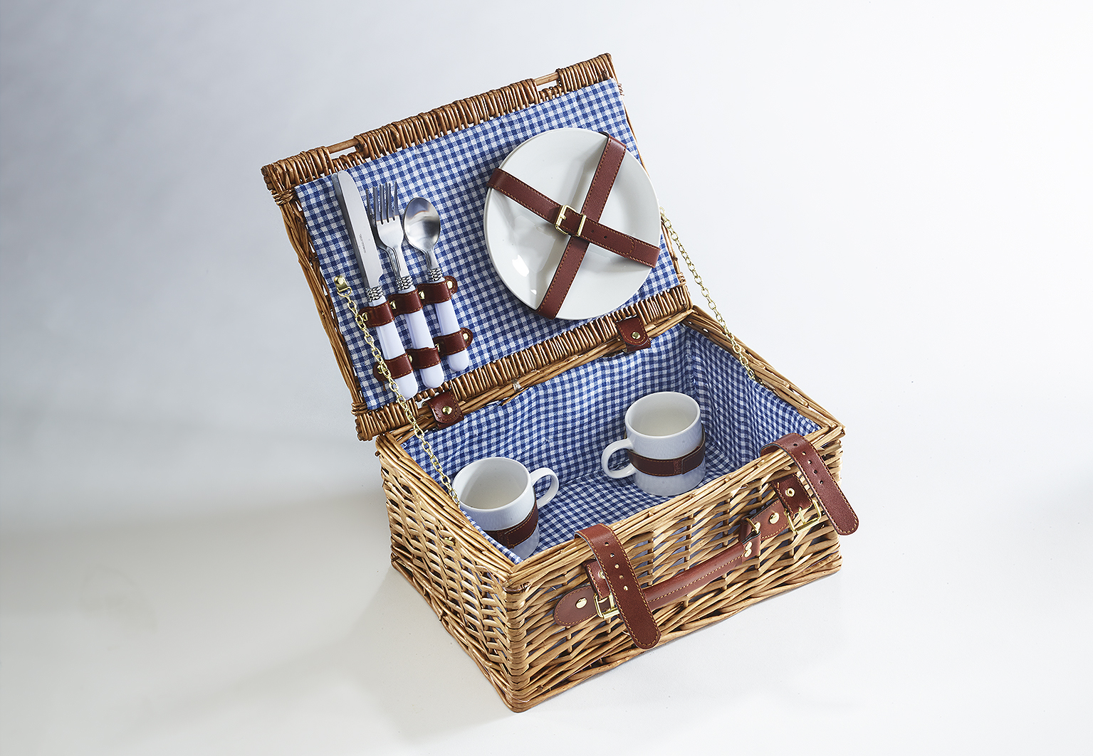 Was gibt es schöneres als ein Picknick bei Sonnenschein im Freien, hierfür ist dieser Picknickkorb/Picknickkoffer von Kobolo bestens geeignet. Er ist mit folgendem Zubehör ausgestattet: 2 Gabeln, 2 Messer, 2 Teelöffel aus Edelstahl mit Kunststoffgriffen, 2 Tassen, 2 Keramikteller. Der Korb mit seiner eckigen Form, wurde in aufwendiger Handarbeit aus gekochter Vollweide geflochten und ist mit klassischem blau-weiß karierten Stoff ausgeschlagen, Griffe und Verschlussteile sind dekorativ aus Kunstleder und Nylon hergestellt. Trotz der umfangreichen Ausstattung findet sich noch genügend Platz für Getränke und Lebensmittel. Länge 36cm x Breite 27cm x Höhe 18cm
