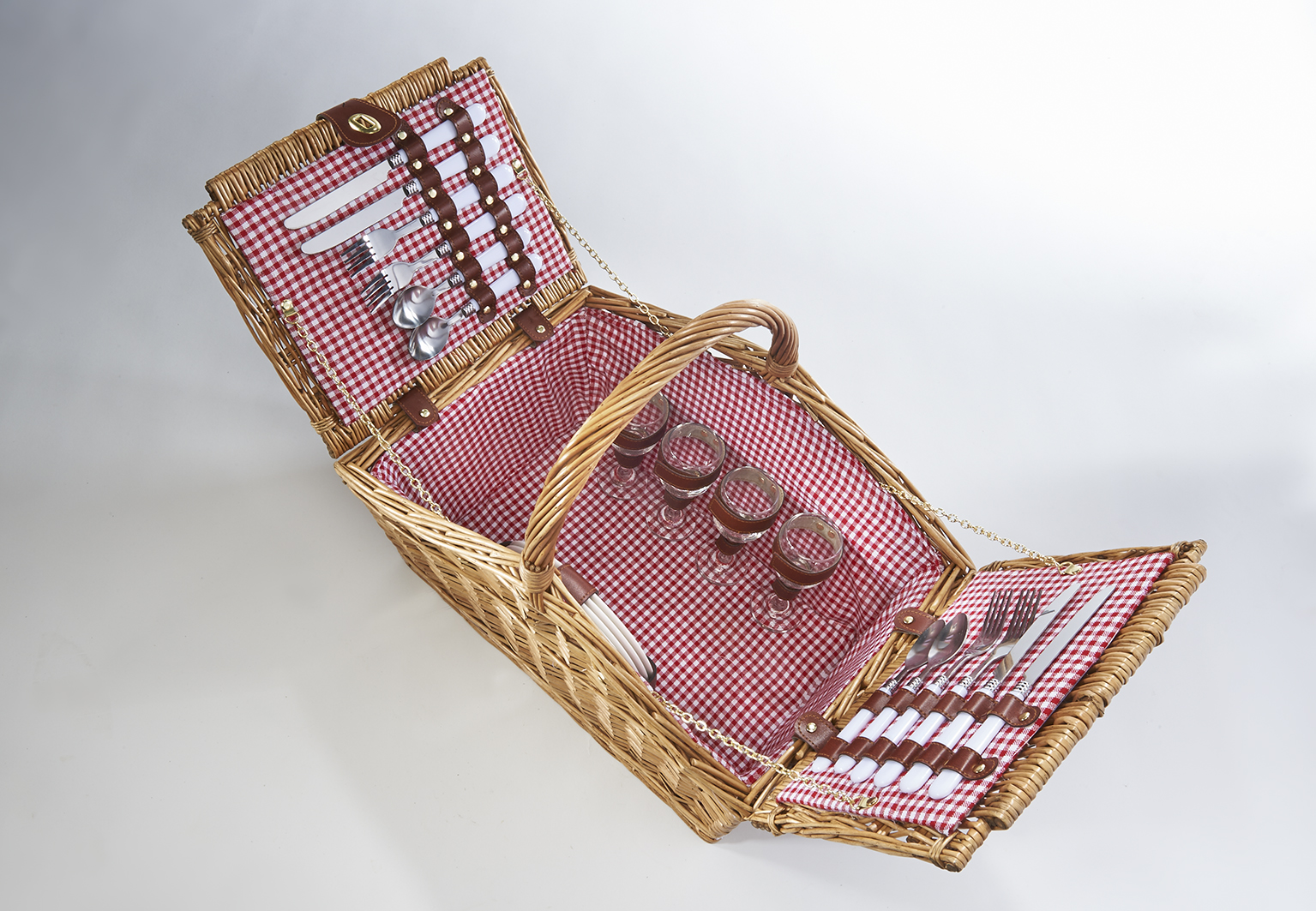 Was gibt es schöneres als ein Picknick bei Sonnenschein im Freien, hierfür ist dieser Picknickkorb/Picknickkoffer von Kobolo bestens geeignet. Der Korb mit seiner außergewöhnlichen, eckigen Form, wurde in aufwendiger Handarbeit aus gekochter Vollweide geflochten und ist mit einem klassischen rot-weiß karierten Stoff ausgeschlagen. Griffe und Verschlussteile sind dekorativ aus Kunstleder hergestellt, Inhalt: 4 Gabeln, 4 Messer, 4 Teelöffel aus Edelstahl mit Kunststoffgriffen, 4 Weingläser und 4 Keramikteller. Trotz der umfangreichen Ausstattung findet sich noch genügend Platz für Getränke und Lebensmittel. Länge 47cm x Breite 32cm x Höhe 21cm