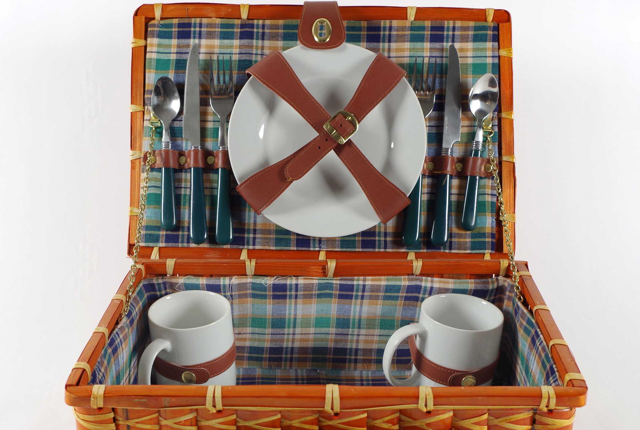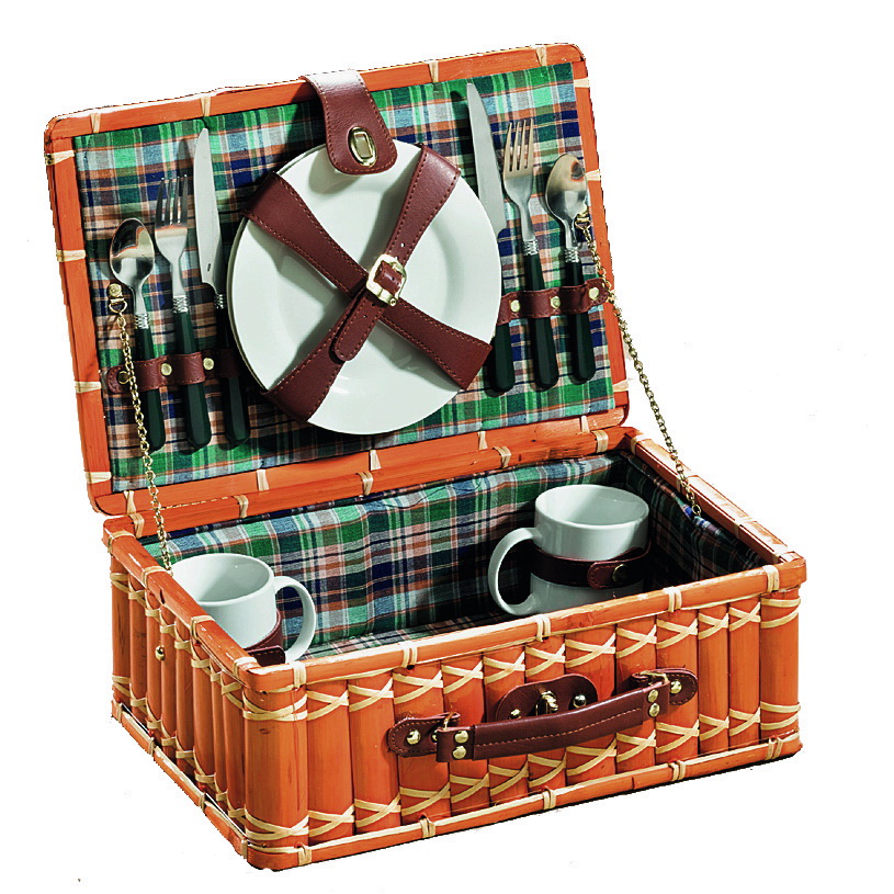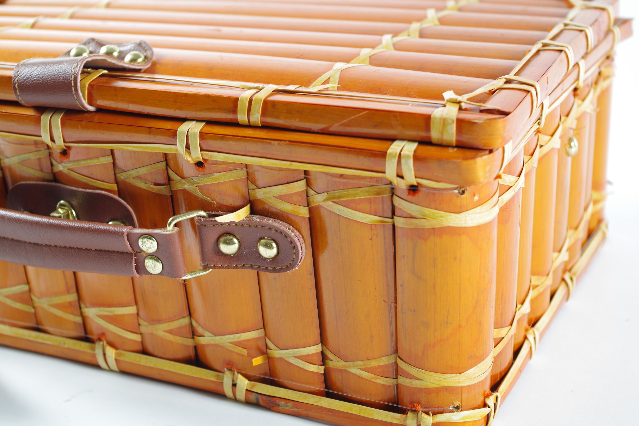 Picknickkoffer aus Bambus von Kobolo. Ein Must-Have für Ihren romantischen Ausflug zu zweit. Gefüllt mit Besteck, Tassen und Tellern. Ausgeschlagen mit einem Stoff im angesagten Karo-Design. Länge 41cm x Breite 28cm x Höhe 15cm