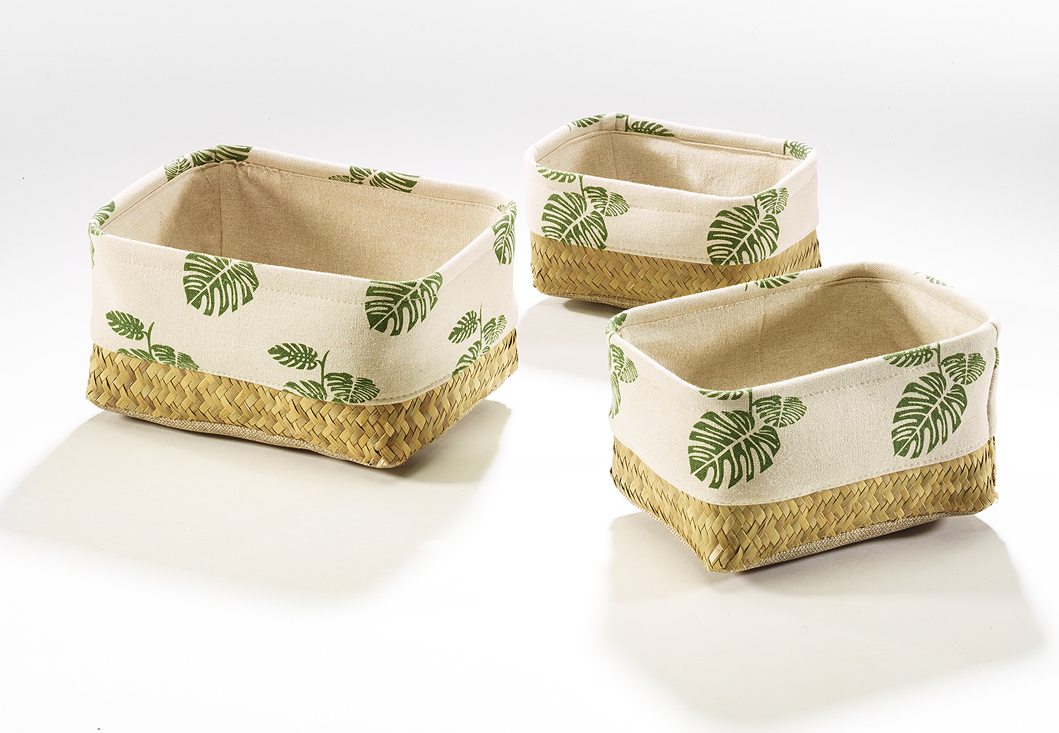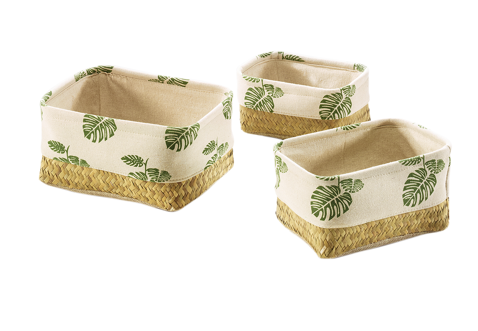 Die eckigen Dekoschalen aus Seegras von Kobolo verschönern durch ihre klassische Form und die warmen Naturmaterialien jedes Zuhause. Der praktische Textileinsatz mit einem modernen Blattmuster rundet das Erscheinungsbild der Dekoschalen harmonisch ab. Das Set beinhaltet für jede Gelegenheit die richtige Größe. Diese Schalen sind als Ordnungshelfer unverzichtbar. Maße Ca.Gr1 20cm x 13cm x 10cm , Gr2 23cm x 16cm x 11cm , Gr3 27cm x 20cm x 14cm