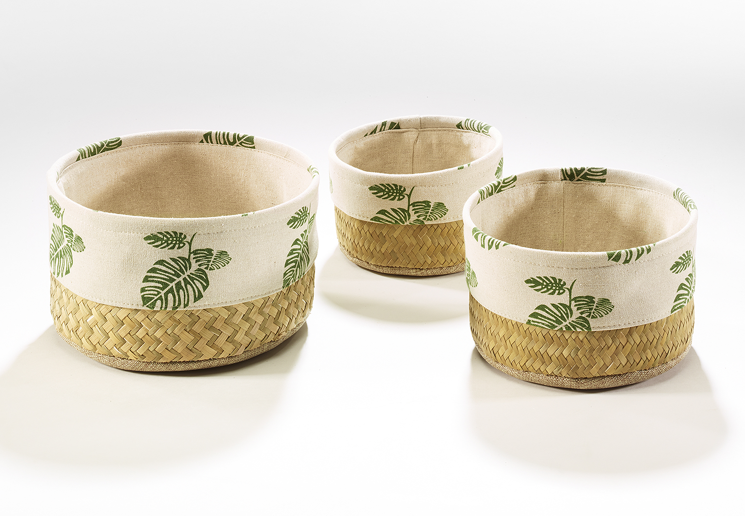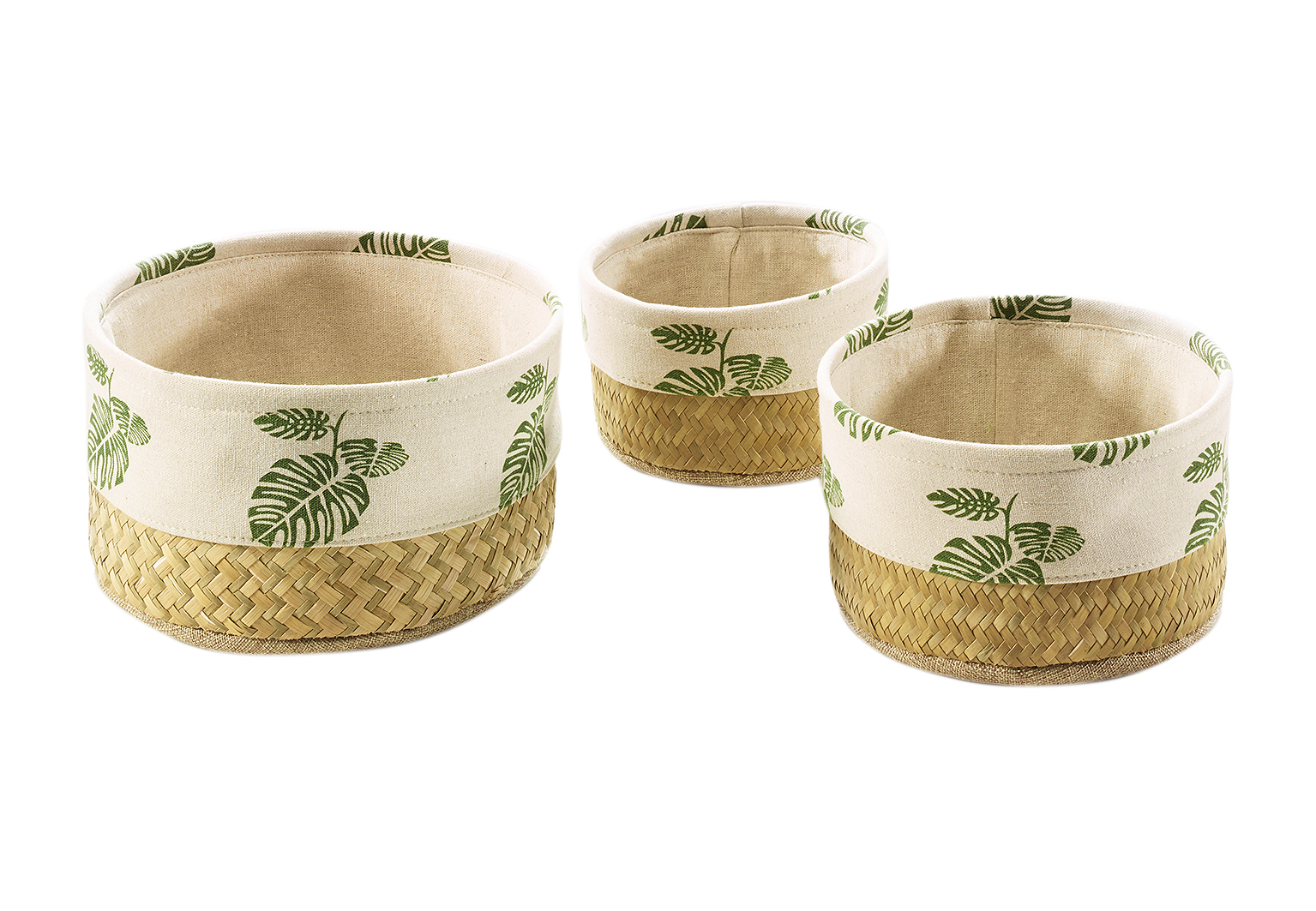 Die runden Dekoschalen aus Seegras von Kobolo verschönern durch ihre klassische Form und die warmen Naturmaterialien jedes Zuhause. Der praktische Textileinsatz mit einem modernen Blattmuster rundet das Erscheinungsbild der Dekoschalen harmonisch ab. Das Set beinhaltet für jede Gelegenheit die richtige Größe. Diese Schalen sind als Ordnungshelfer unverzichtbar. Maße Ca.Gr1 Ø18cm x Höhe 10cm , Gr2 Ø21cm x Höhe 11cm , Gr3 Ø25cm x Höhe 12cm