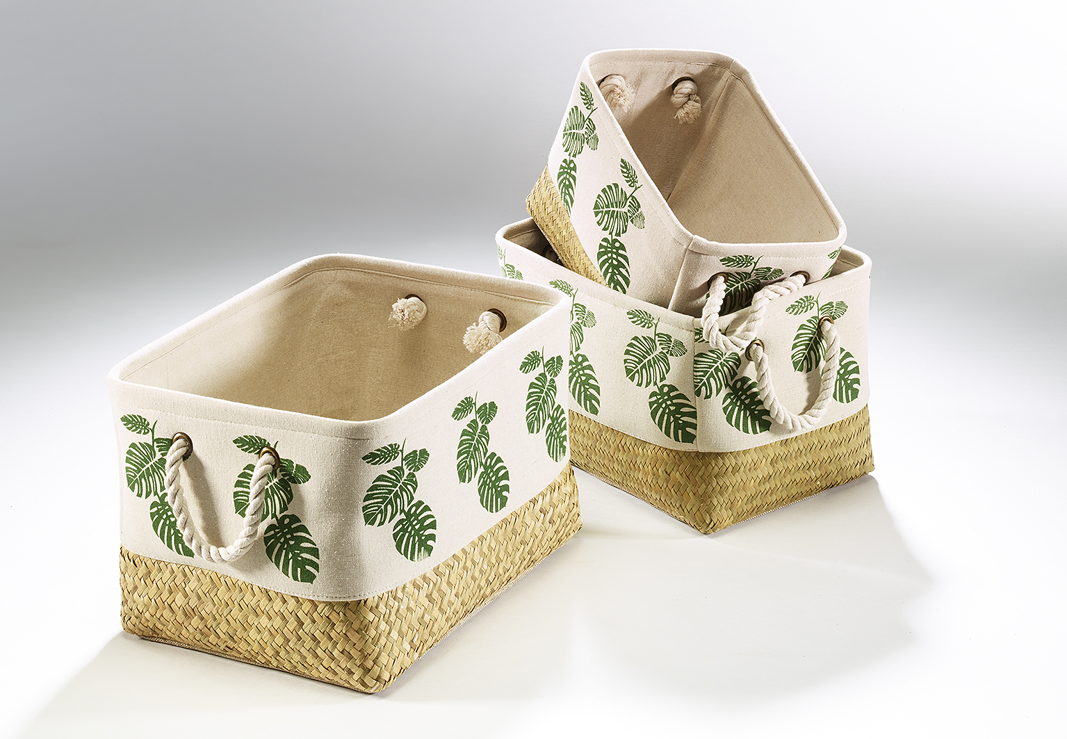 Die Regalkörbe von Kobolo überzeugen durch eine Mischung aus naturfarbenem Seegras und einem Textileinsatz mit modernem Blattmuster. Die Regalkörbe eignen sich perfekt um in Ihrem Zuhause Ordnung zu schaffen und werten das Ambiente optisch auf. Sie werden nie wieder auf diese kleinen Ordnungshelfer verzichten wollen. Lieferung erfolgt ohne Deko. Maße Ca.Gr1 30cm x 20cm x 19cm , Gr2 35cm x 25cm x 21cm , Gr3 40cm x 30cm x 23cm