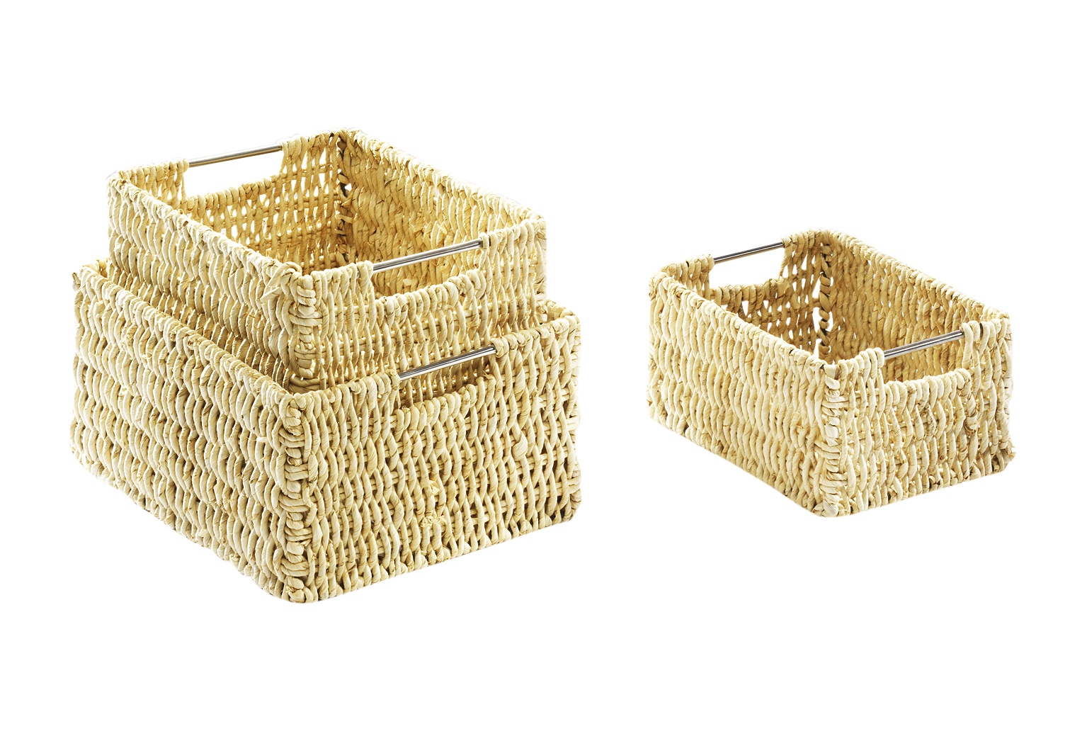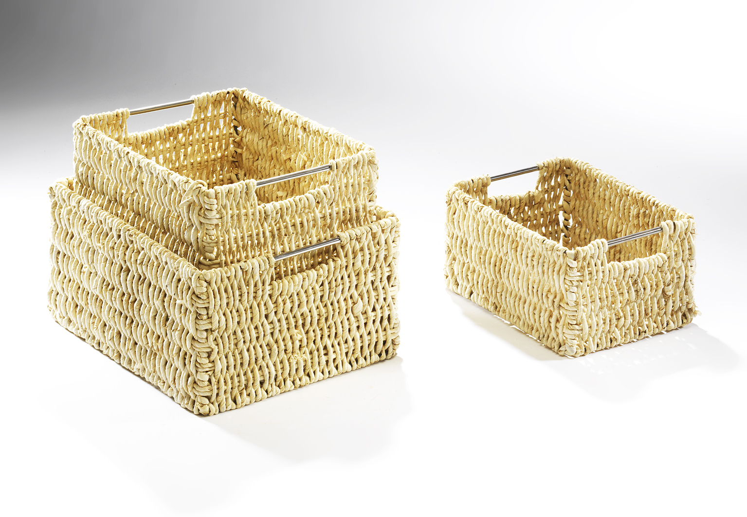 Diese rechteckigen Regalkörbe aus Maisblatt mit Metallgriffen sind die idealen Ordnungshelfer für die vielen kleinen und größeren Dinge in ihrem Haushalt. Sie sind ideal für Spielzeug, Werkzeug usw. Die Körbe werden aus Maisblatt, in Handarbeit über einen Metallrahmen geflochten. Das Set enthält für jede Gelegenheit die richtige Größe, ihre Schränke oder Regale werden auf eine besondere Art verschönert und aufgewertet. Maße Ca.Gr1 29cm x 21cm x 13cm , Gr2 33cm x 26cm x 15cm , Gr3 38cm x 31cm x 17cm