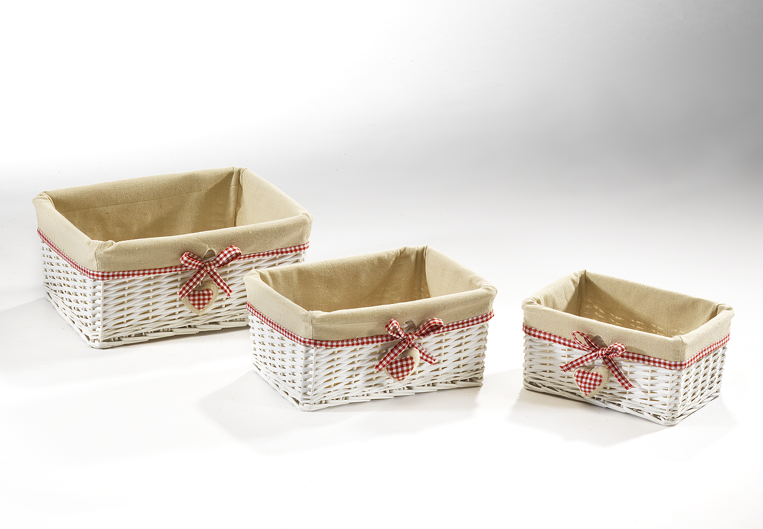Die Regalkörbe im 3er Set von Kobolo sind aus Spaltweide gefertigt und mit Stoff ausgekleidet. Sie bringen Ordnung in jeden Raum und können leicht ineinander gestapelt aufbewahrt werden. Die dezente Farbgebung in weiß mit einer Bordüre in rot-weißem Karo macht sie nicht nur zu idealen Helfern im Haushalt, sondern auch zu schönen Dekokörben. Ein kleiner Herzanhänger aus Stoff verleiht den Regalkörben ihren besonderen Charme. Maße Ca.Gr1 29cm x 20cm x 12cm , Gr2 34cm x 24cm x 14cm , Gr3 39cm x 29cm x 16cm