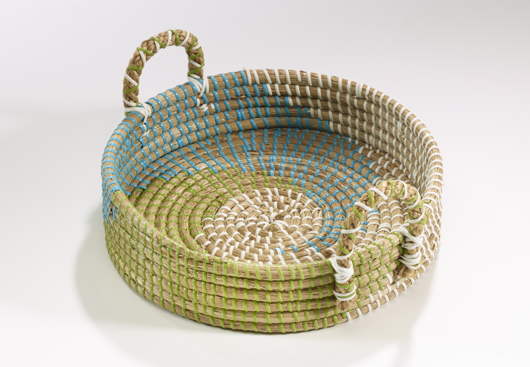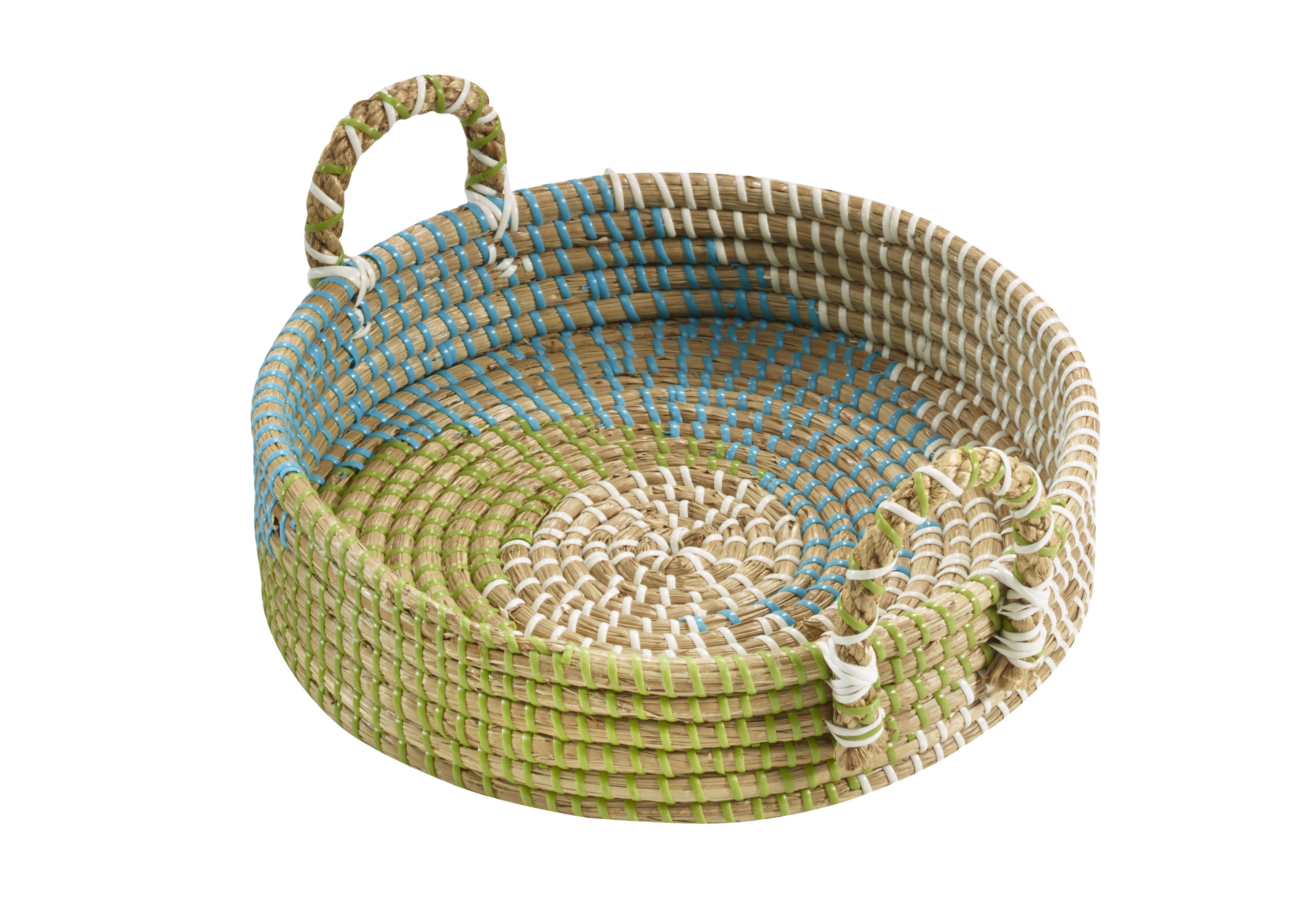 Das Dekotablett von Kobolo ist aus naturfarbenem Seegras gefertigt und mit zwei praktischen Griffen ausgestattet. Mit blauem und grünem Kunststoffband umwickelte Elemente ergeben ein schwungvolles Muster und verleihen dem Seegrastablett eine frische und fröhliche Note.Durchmesser 30cm x Höhe 7cm