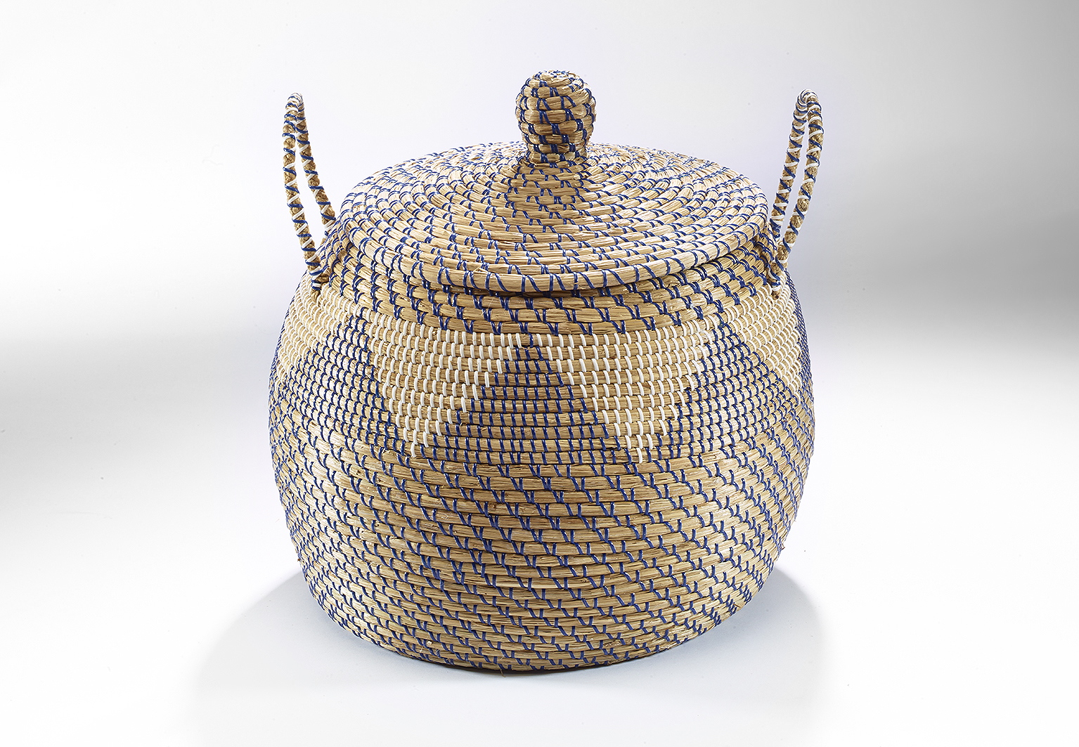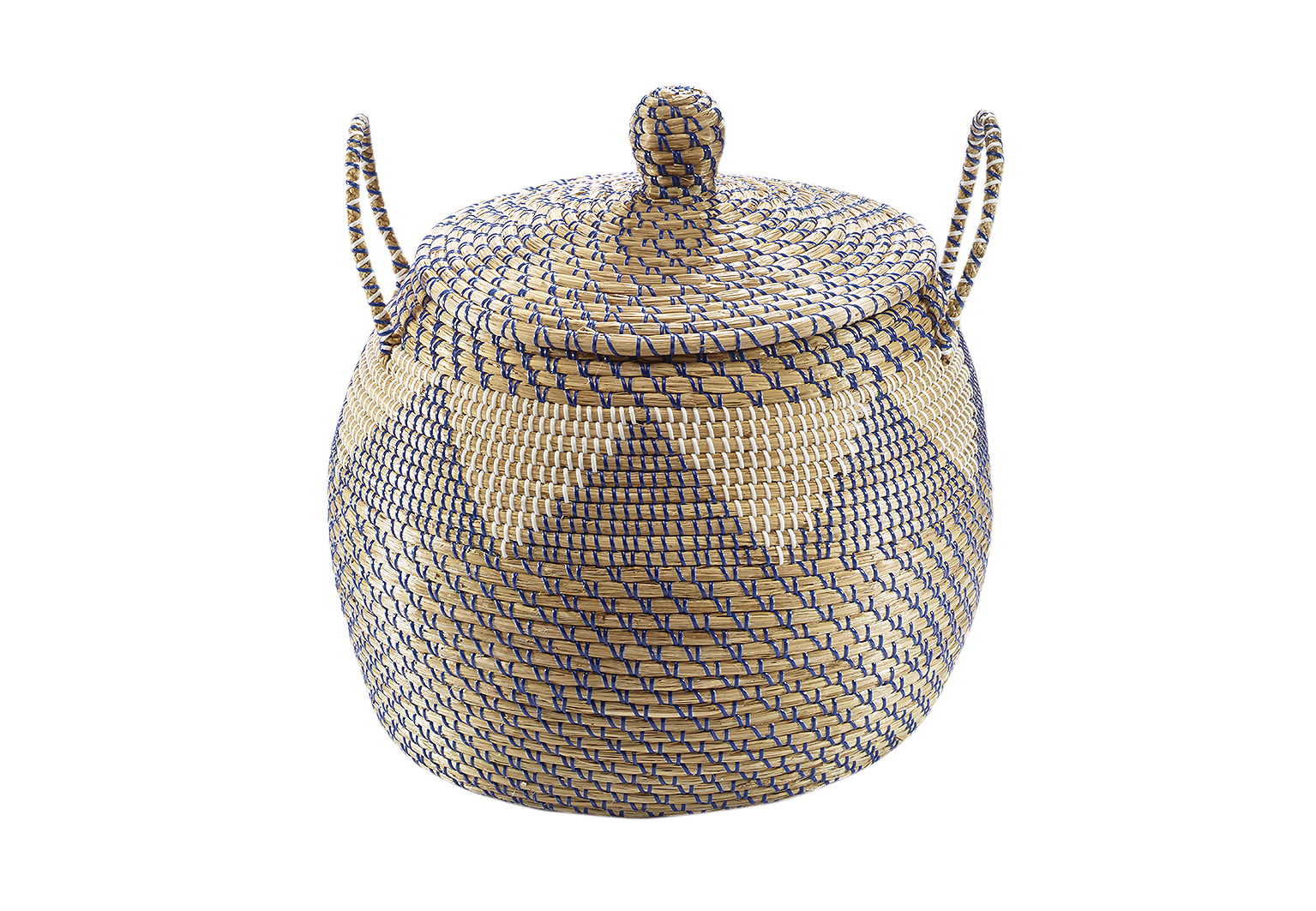 Der Dekokorb von Kobolo ist aus naturfarbenem Seegras gefertigt, das mit blauen und weißen Kunststoffbändern in einem harmonischen Muster durchwirkt ist. Ausgestattet mit einem Deckel und zwei praktischen Griffen, eignet sich der Seegraskorb für die verschiedensten Gelegenheiten.Durchmesser 36cm x Höhe 34cm