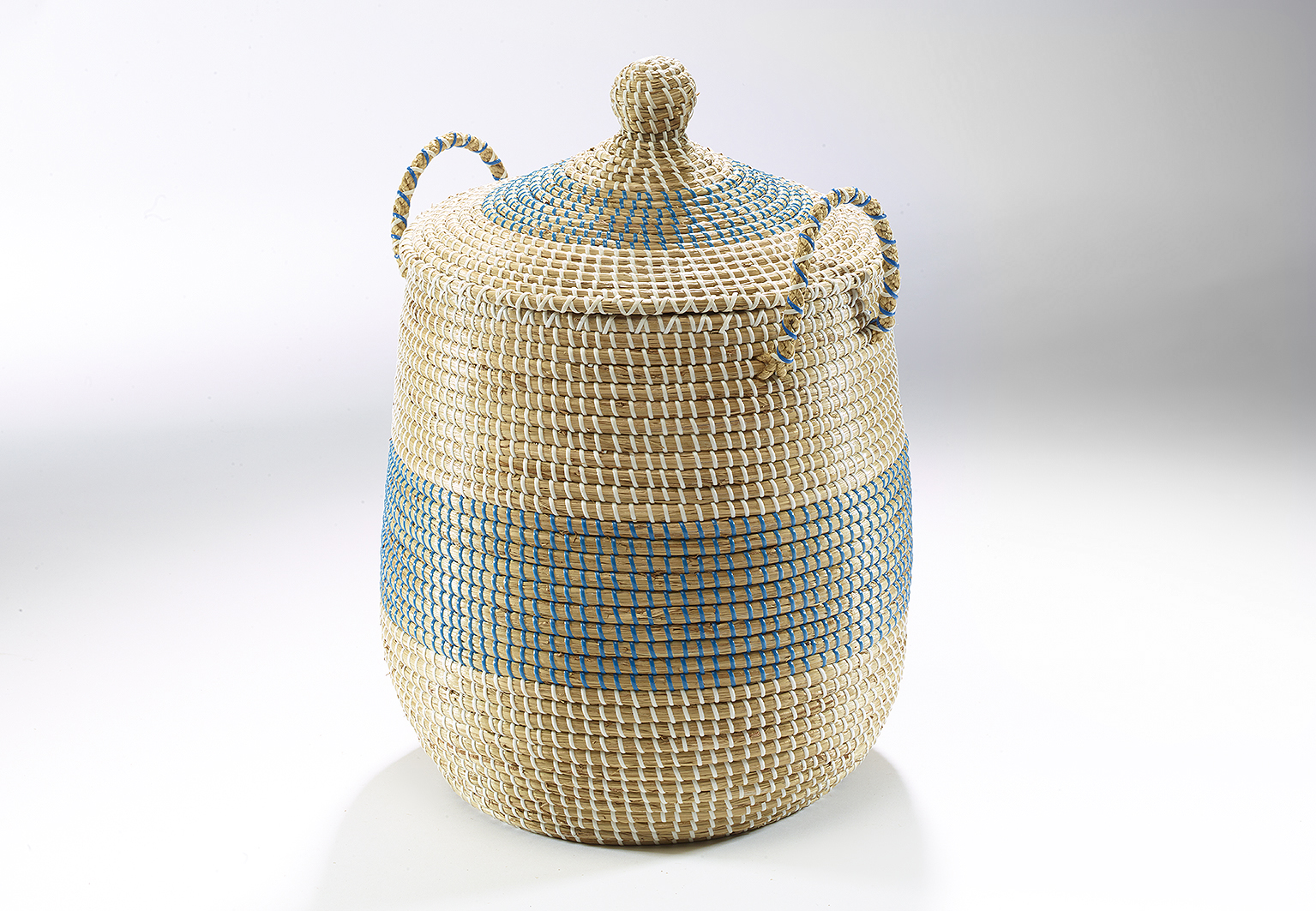 Der Wäschekorb von Kobolo ist aus naturfarbenem Seegras gefertigt und mit zwei Griffen und einem Deckel versehen. Einzelne Elemente mit blauem und weißem Kunststoffband umwickelt ergeben ein maritimes Streifenmuster und verleihem dem Seegraskorb eine fröhliche Note.Durchmesser 36cm x Höhe 40cm