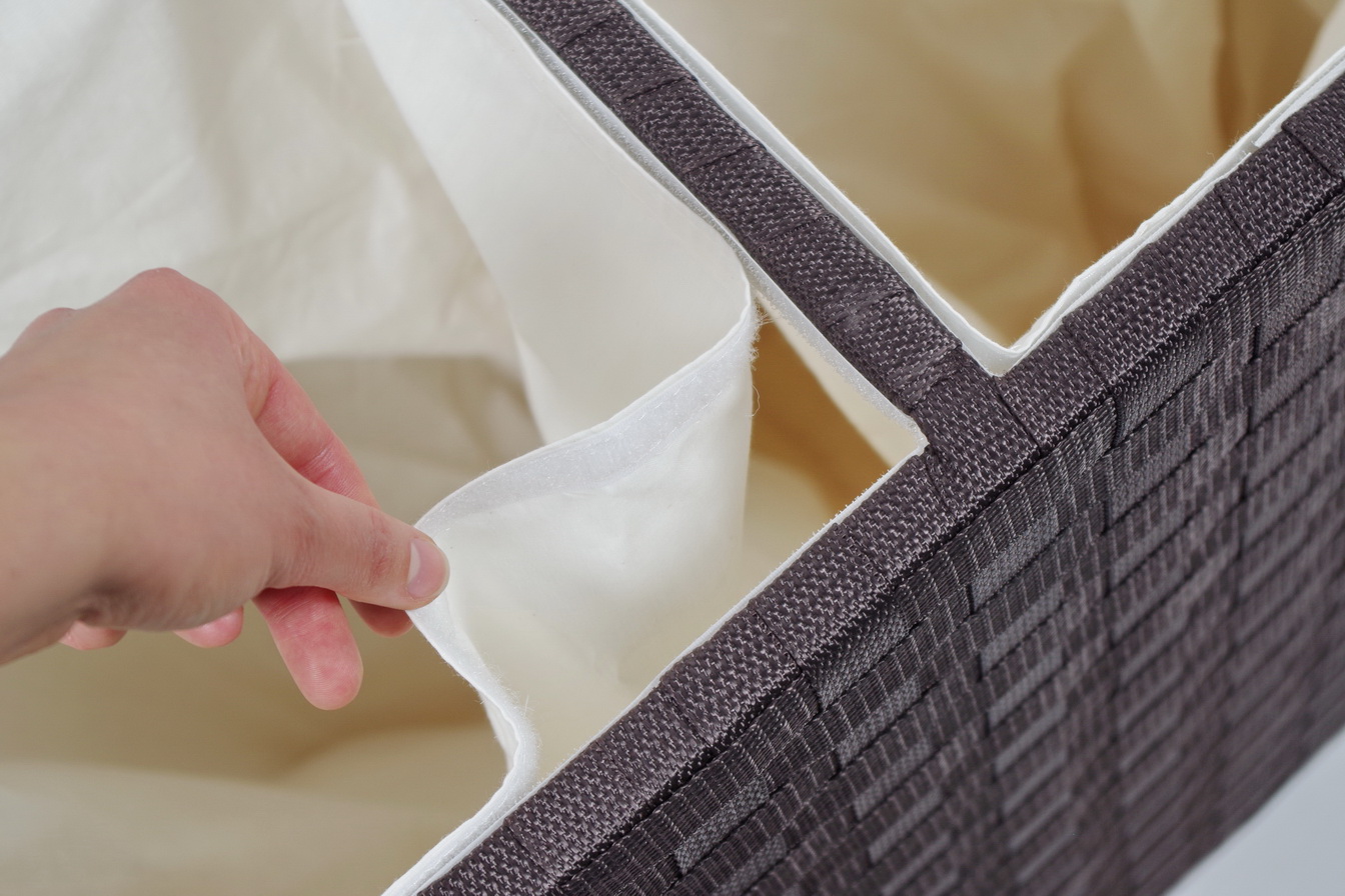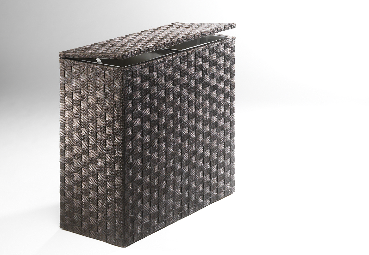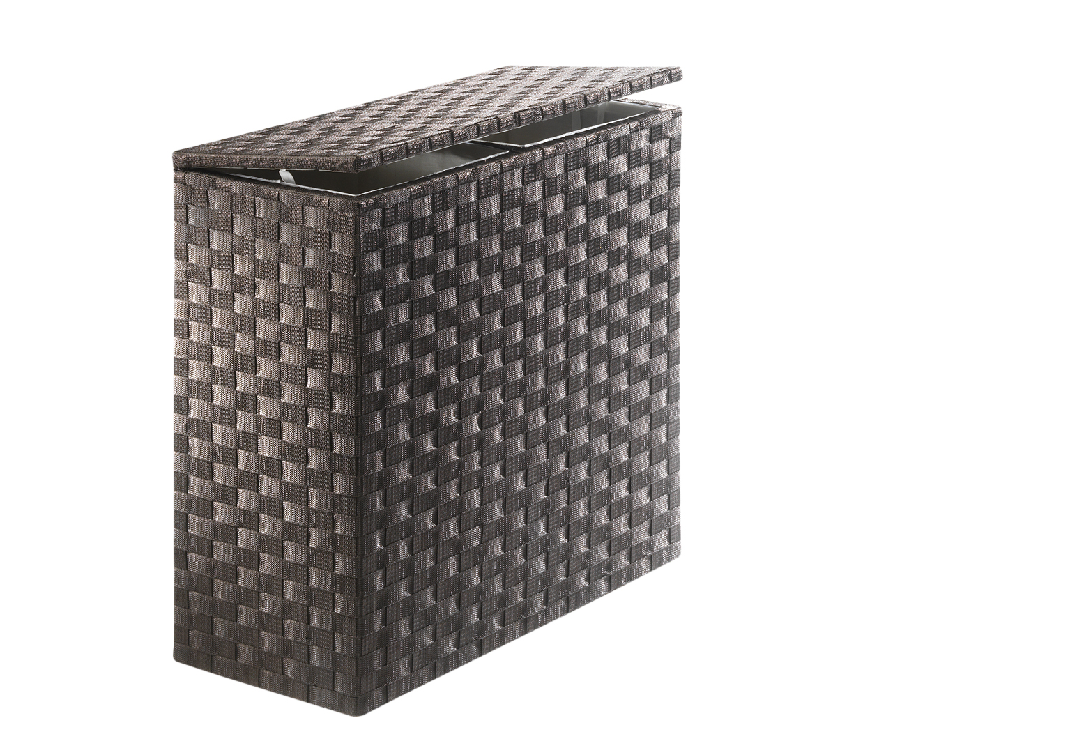Wäschesortierer von Kobolo mit zwei Fächer Oberflächendeko aus Nylon geflochten. Ausgeschlagen mit Textilfutter (100% Baumwolle), ein Blickfang für jedes Bad.Dieser Artikel wird in Handarbeit und aus natürlich gewachsenen Materialien gefertigt. Länge 65cm x Breite 31cm x Höhe 64cm