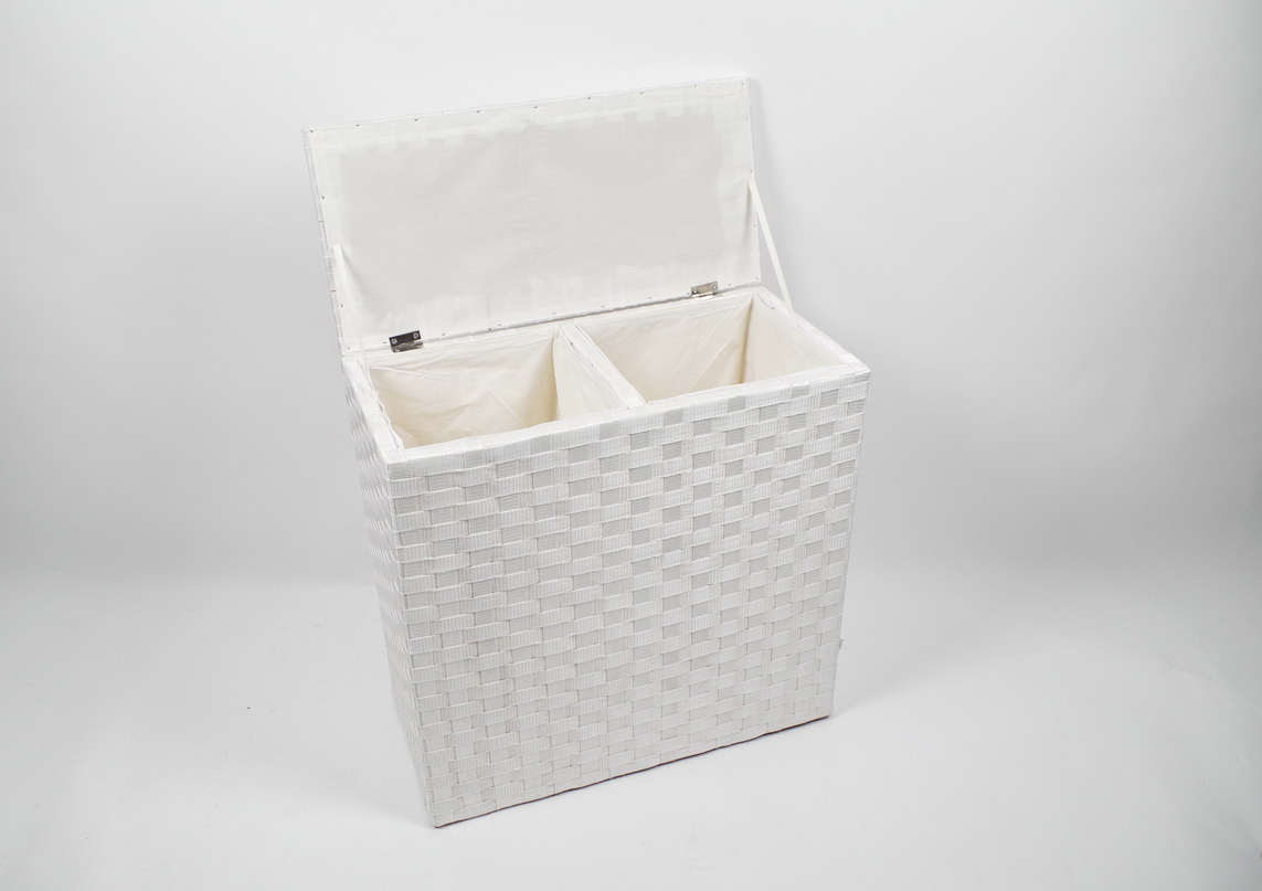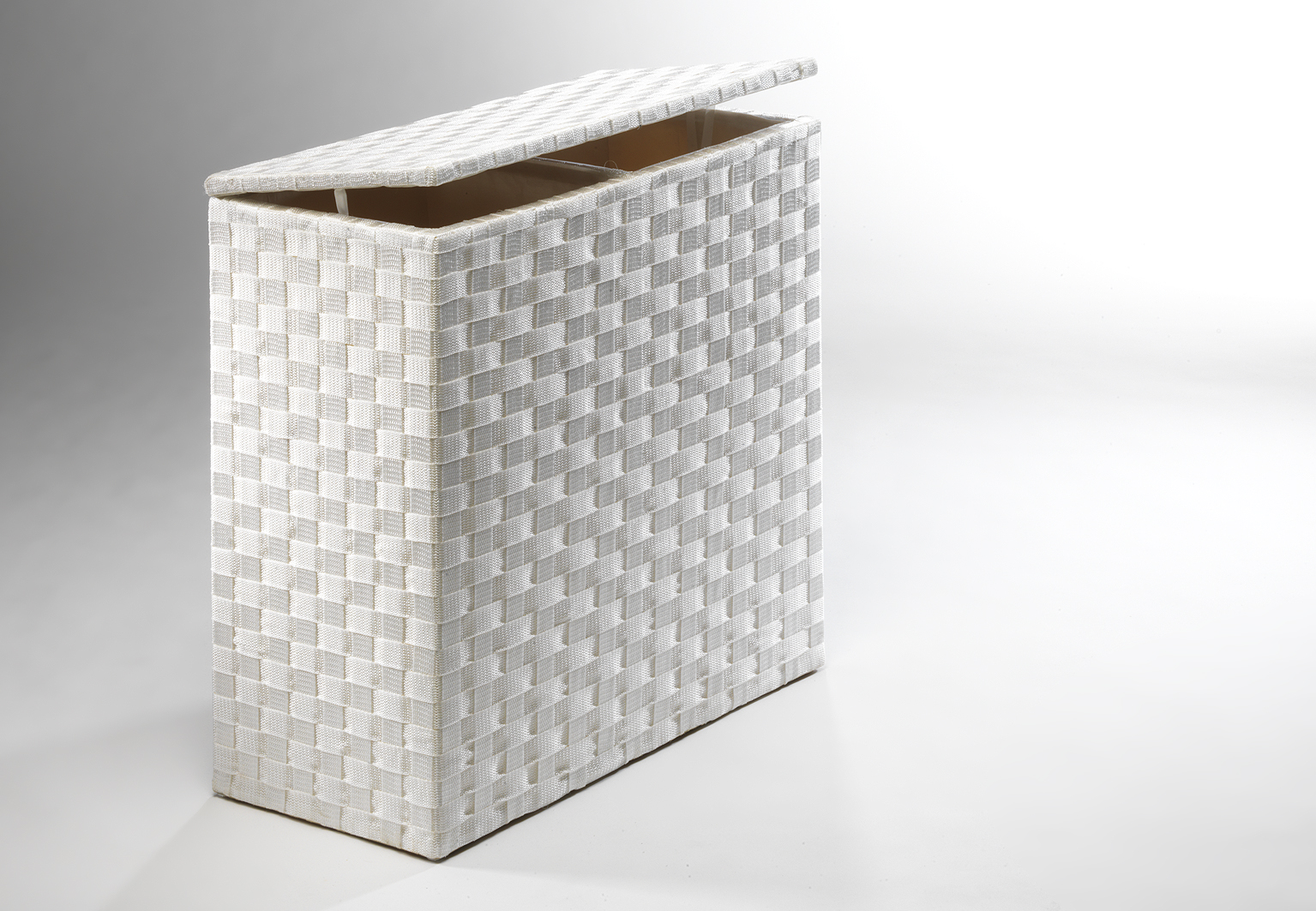 Wäschesortierer von Kobolo mit zwei Fächern, Oberflächendeko aus Nylon geflochten. Ausgeschlagen mit Textilfutter (100% Baumwolle), ein Blickfang für jedes Bad. Dieser Artikel wird in Handarbeit gefertigt. Geringe Abweichungen in den Maßen, Formen und Farben sind daher möglich und unterstreichen nur die Einzigartigkeit unserer Produkte. Länge 65cm x Breite 31cm x Höhe 64cm