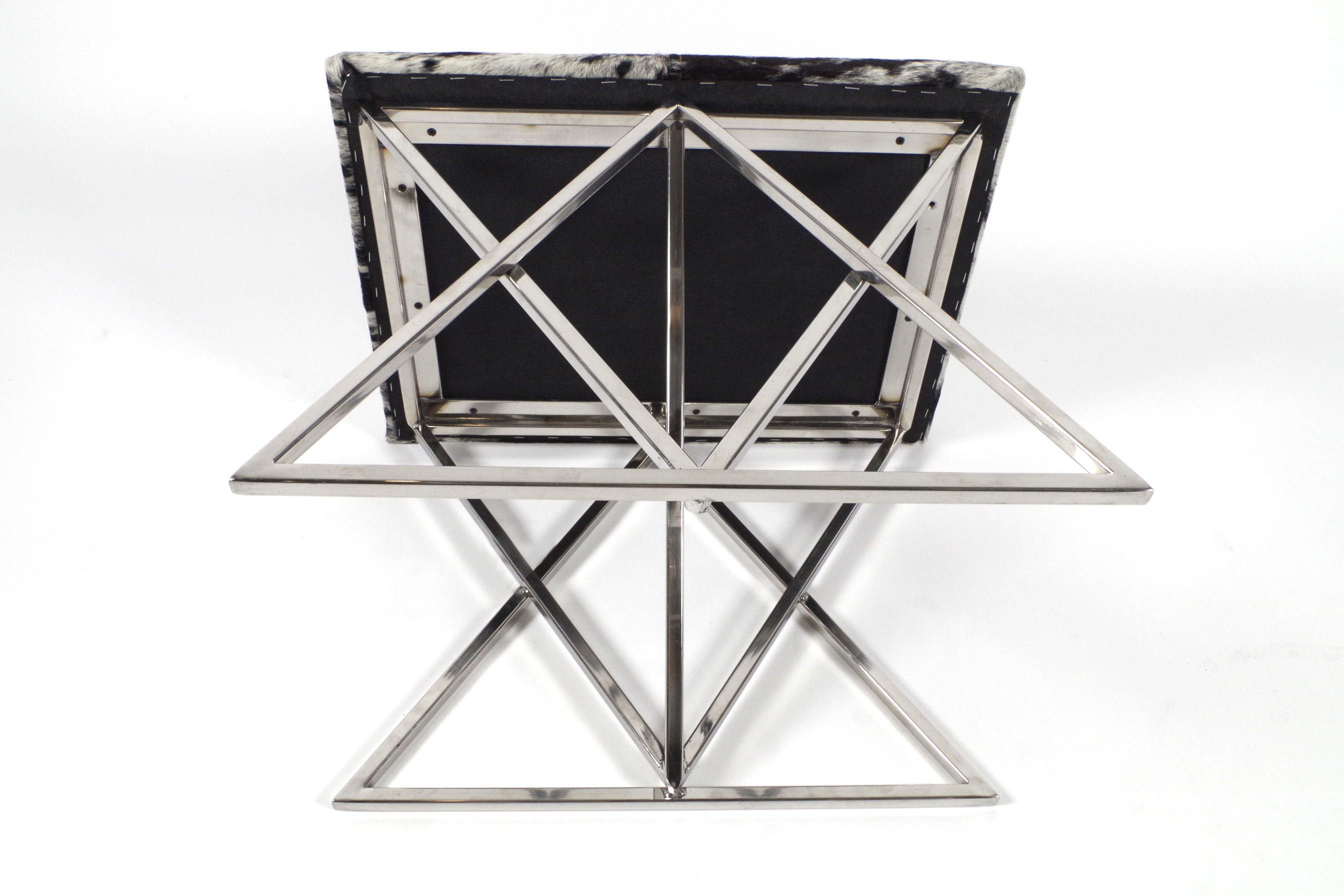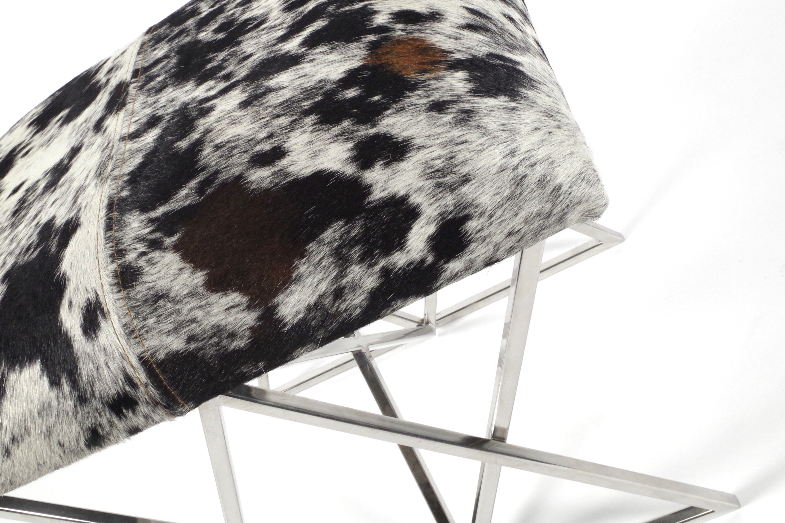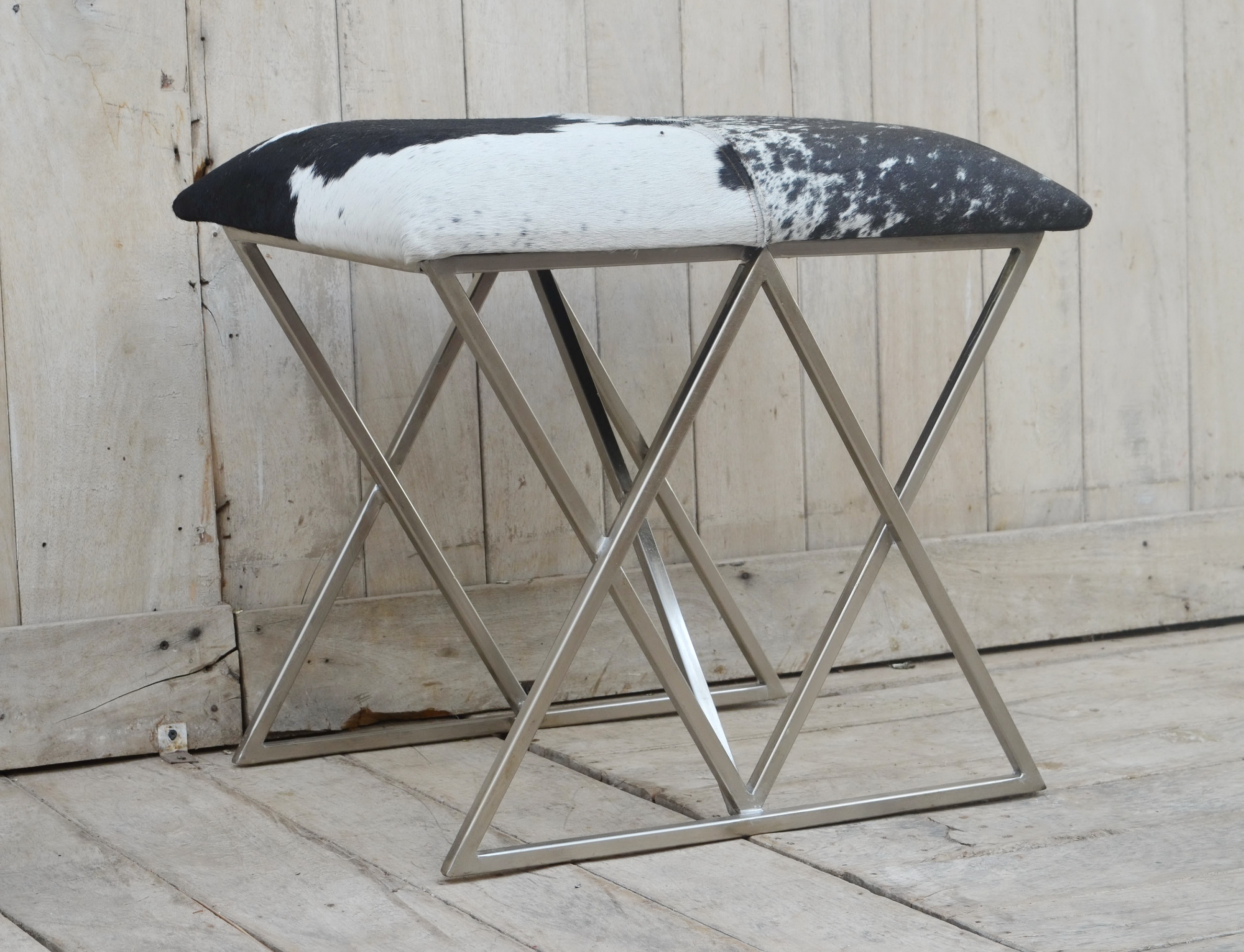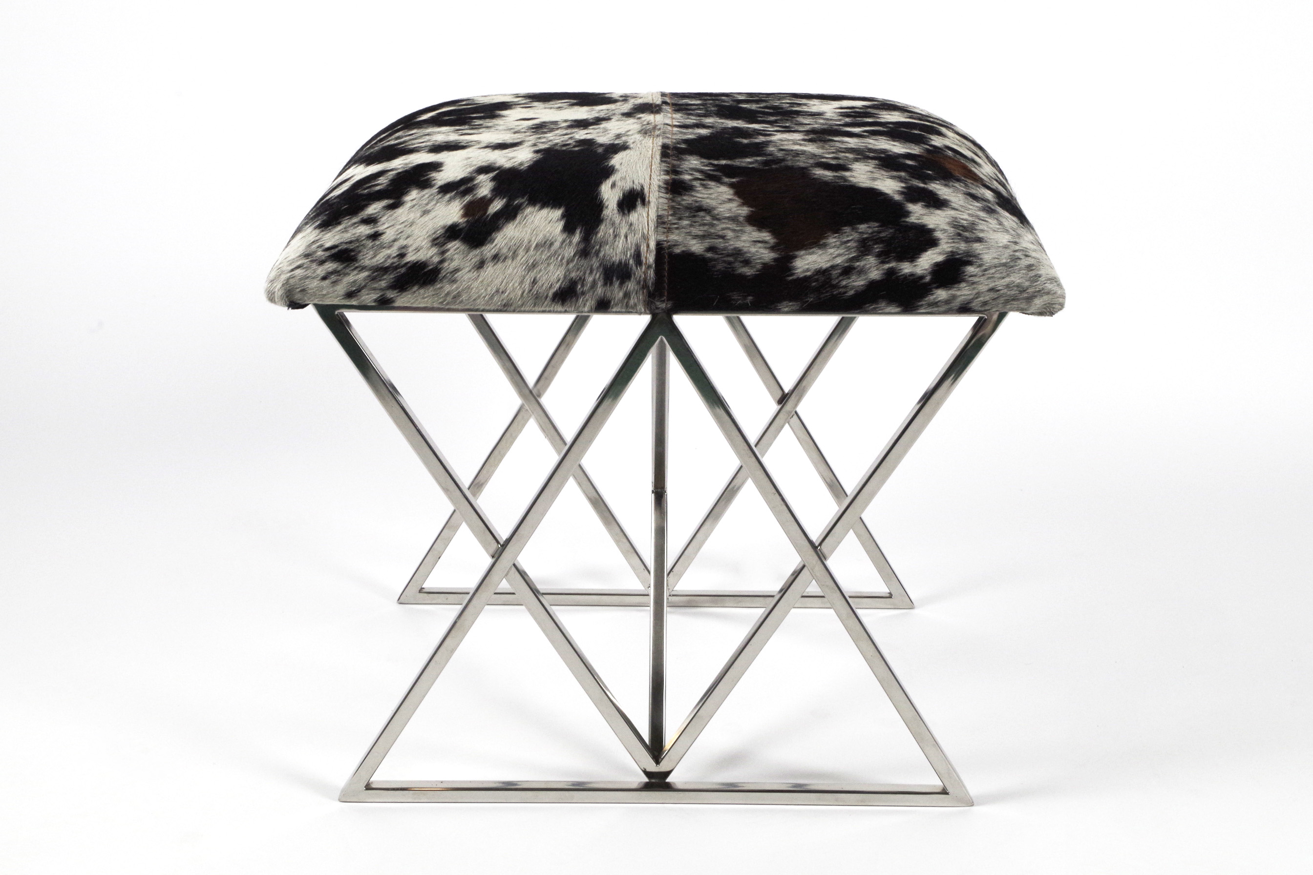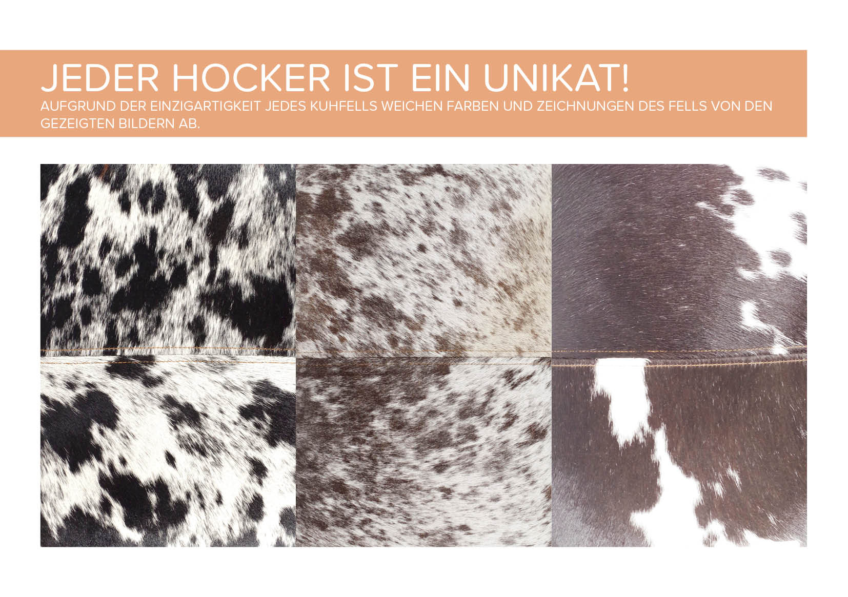 Moderner Hocker mit Fellbesatz und Metallgestell von Kobolo. Dieser einzigartige Hocker ist aus einem massiven Metallgestell gefertigt. Er ist bespannt mit Kuhfell, was jeden Hocker zu einem unverwechselbaren Unikat macht. Bitte betrachen sie das Bild als Beispiel. Länge 62cm x Breite 47cm x Höhe 56cm